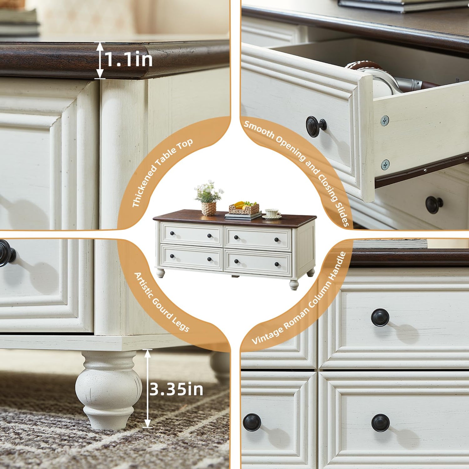 - UNIQUE DETAILED DESIGN: Featuring 4 equally sized drawers and vintage round brass knobs, this wooden coffee table features superb craftsmanship and stable construction. Its 3.35-inch thick curved solid wood legs ensure stability and greater weight capacity. Reinforced legs in the center provide additional support for heavy objects.