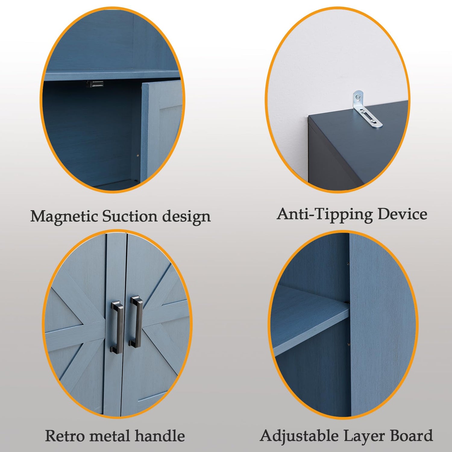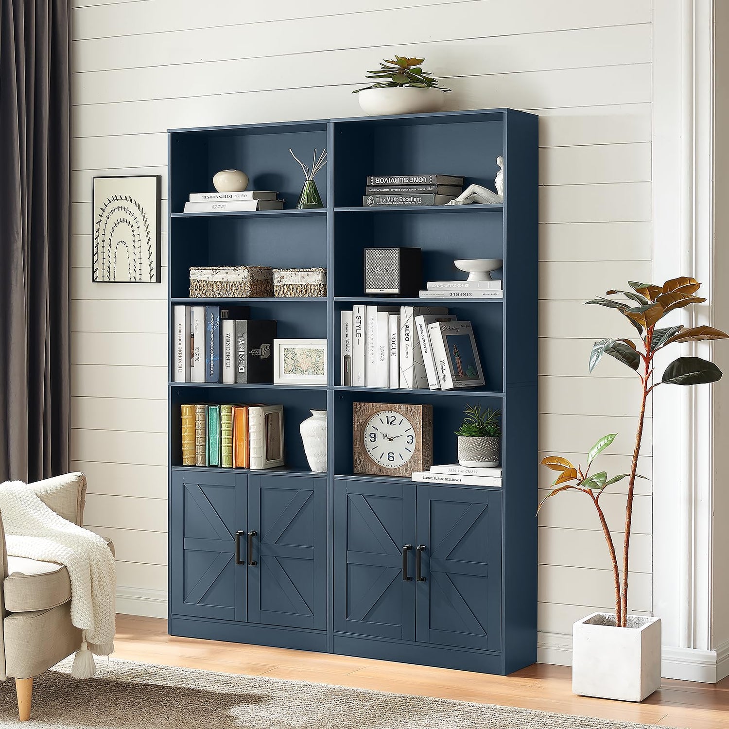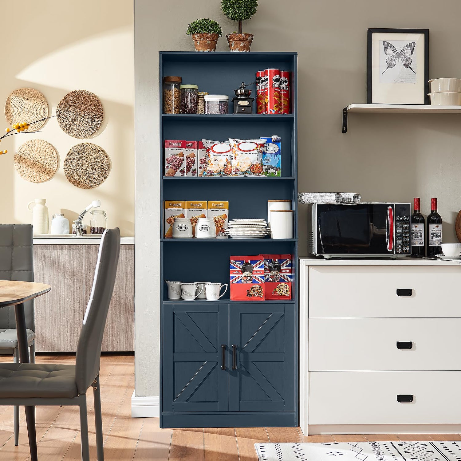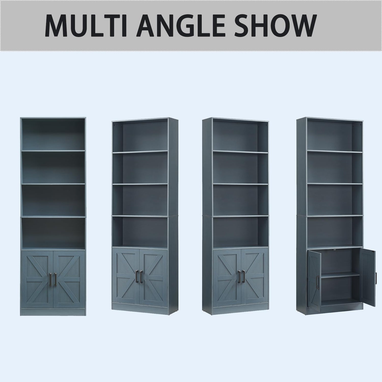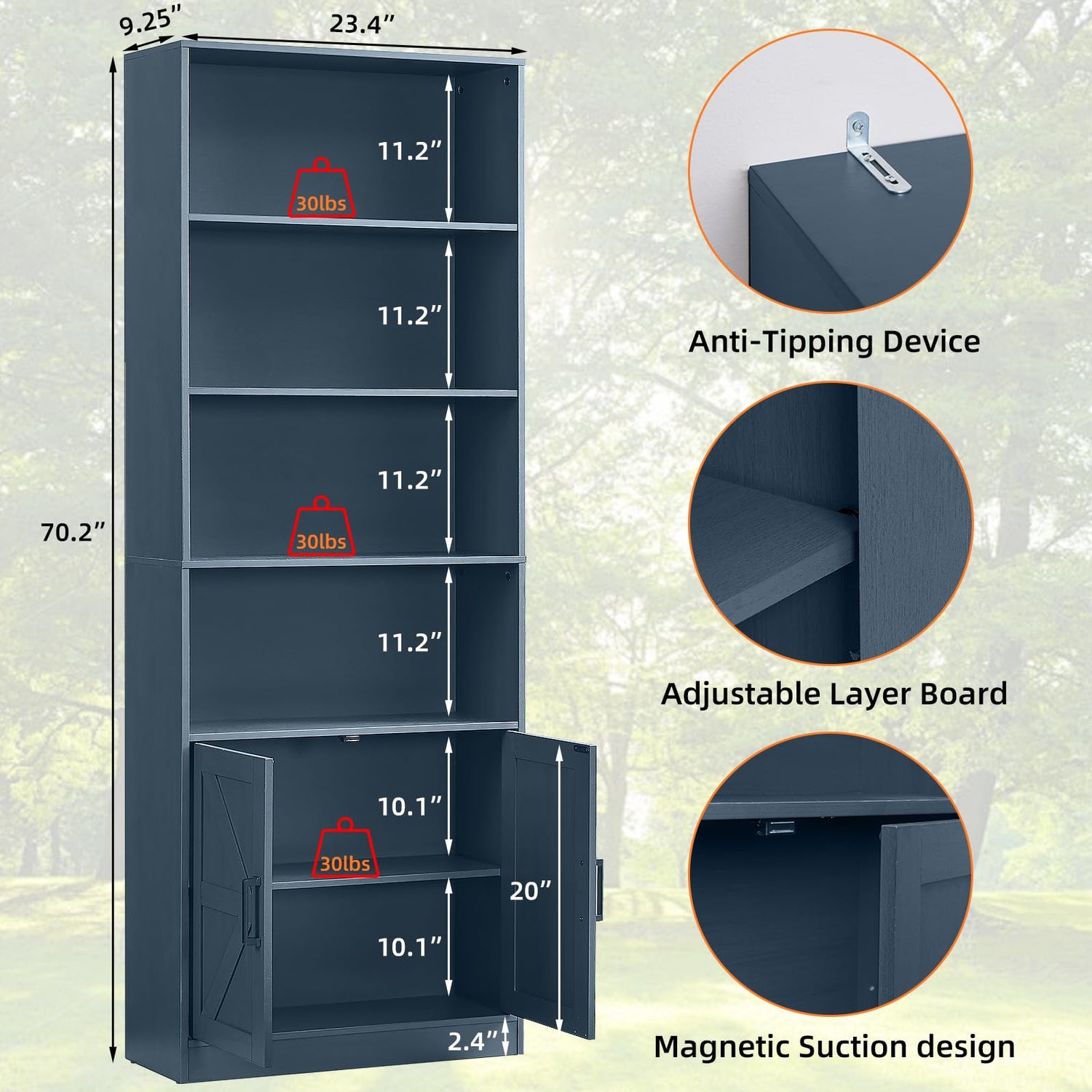 RWYHG 70in Tall Bookshelf 6 Tier Bookcase with Barn Doors and Adjustable Shelf, Blue Farmhouse Book Shelves with Storage Cabinet, Wood Floor Standing Display Bookshelve for Bedroom,Living Room,Kitchen
