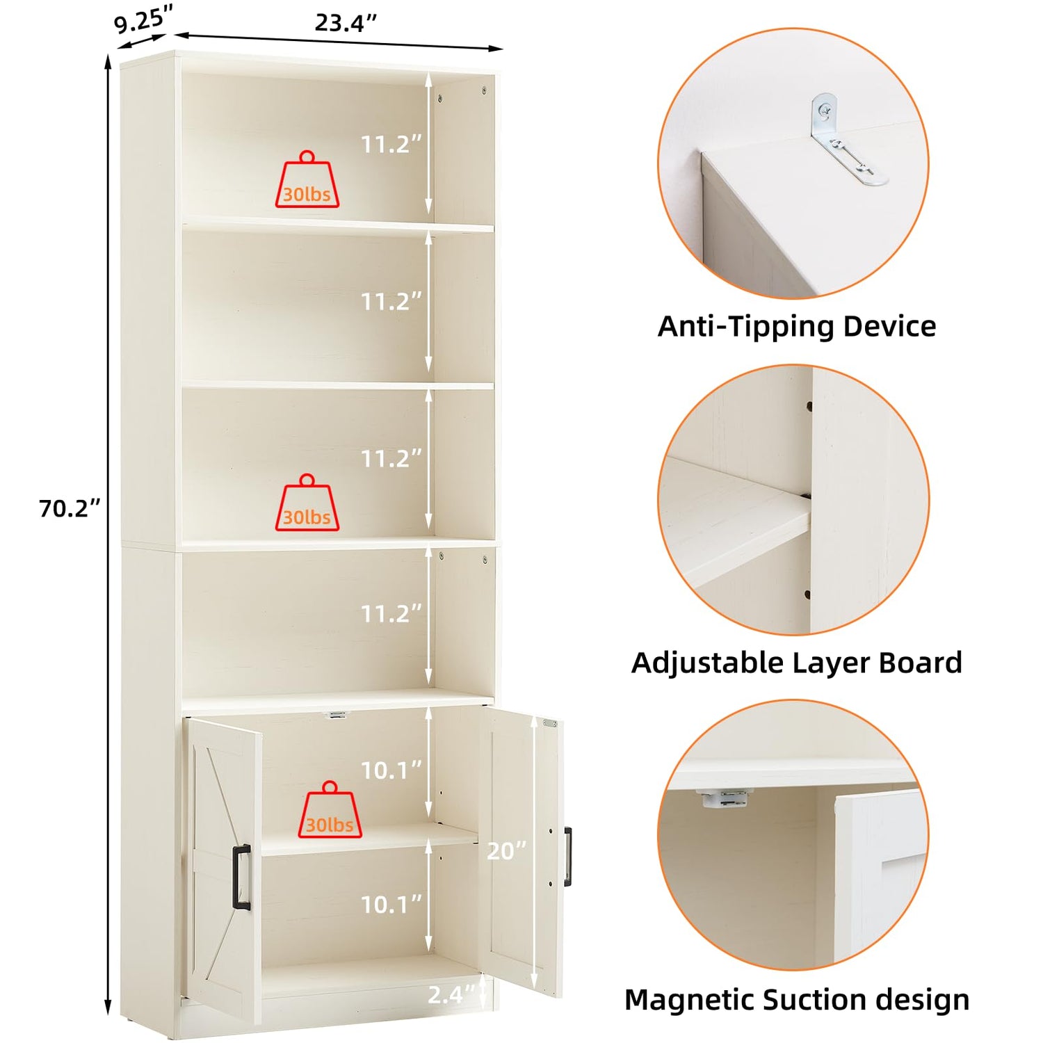- [HIGH QUALITY AND STURDY MATERIAL]The Farmhouse Bookshelf is made of high quality wood,shelves size 23.4*9.25*70.2inches,each shelf can bear up to 30 lbs. and the cabinet door is designed with magnetic door, which has certain durability and stability to withstand long term use and avoid being replaced frequently.