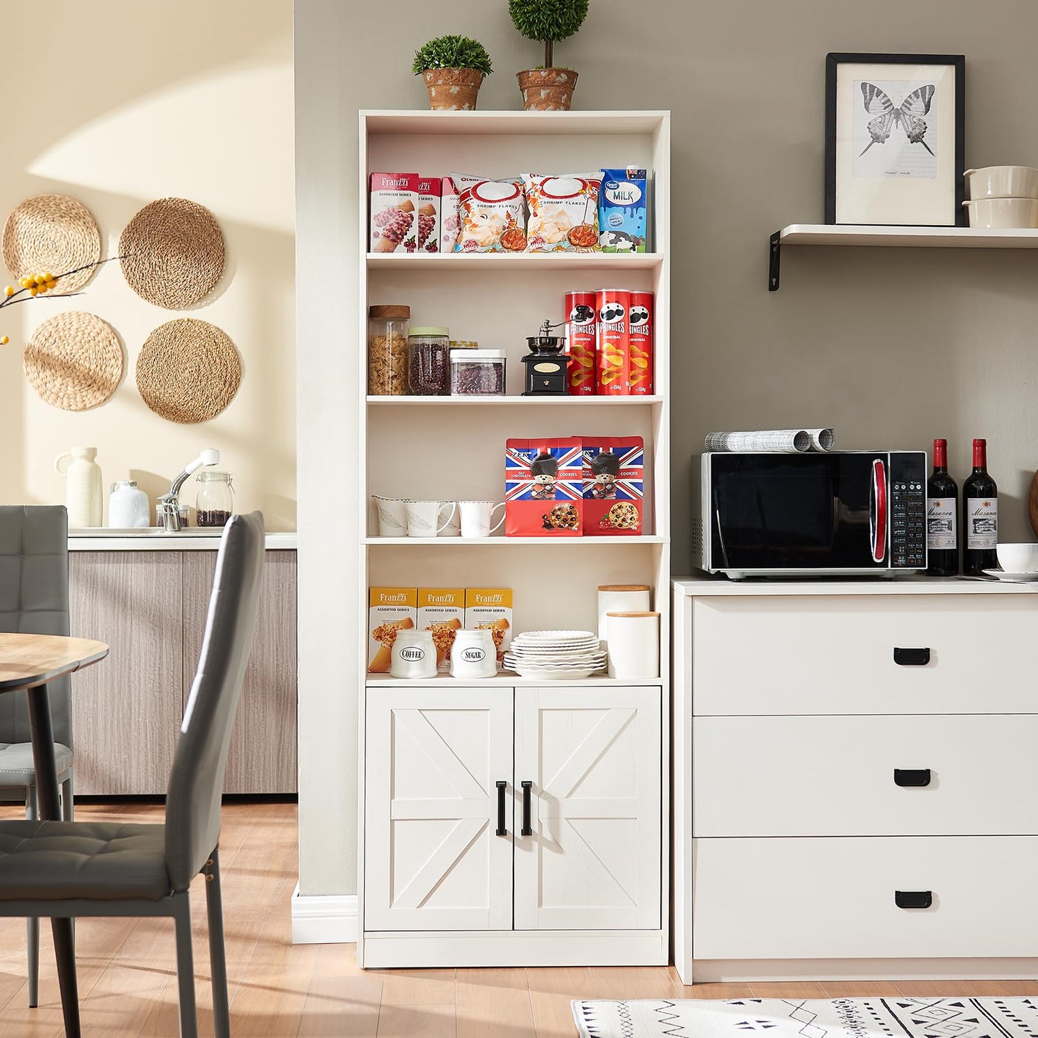 - [MULTI-FUNCTIONAL BOOK CASE]The Farmhouse Style Bookshelf is a versatile piece of furniture that can be used as a living room display cabinet, kitchen storage cabinet, Study Room bookceses, and the adjustable shelves on the barn doors allow you to easily customise the storage space to suit your needs.