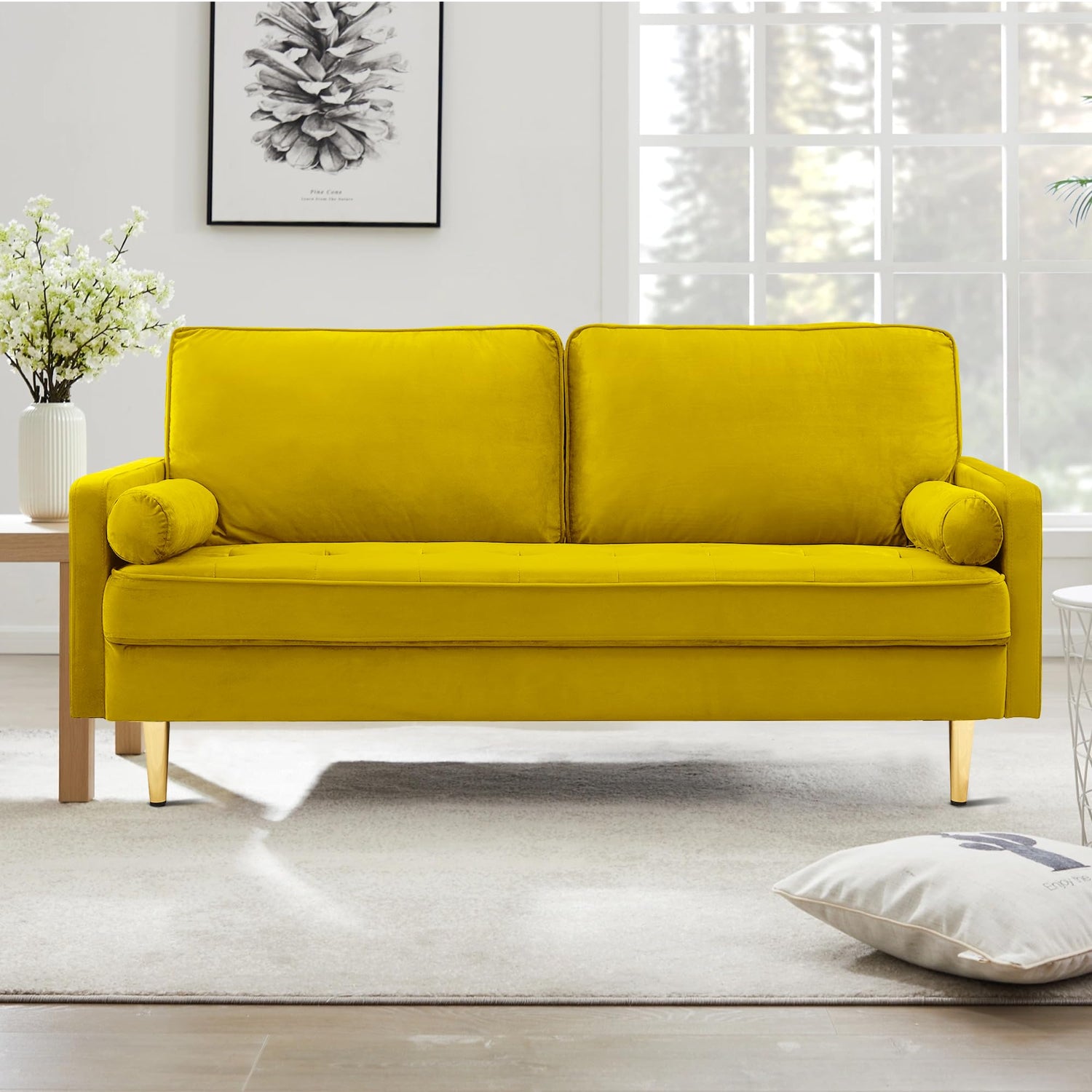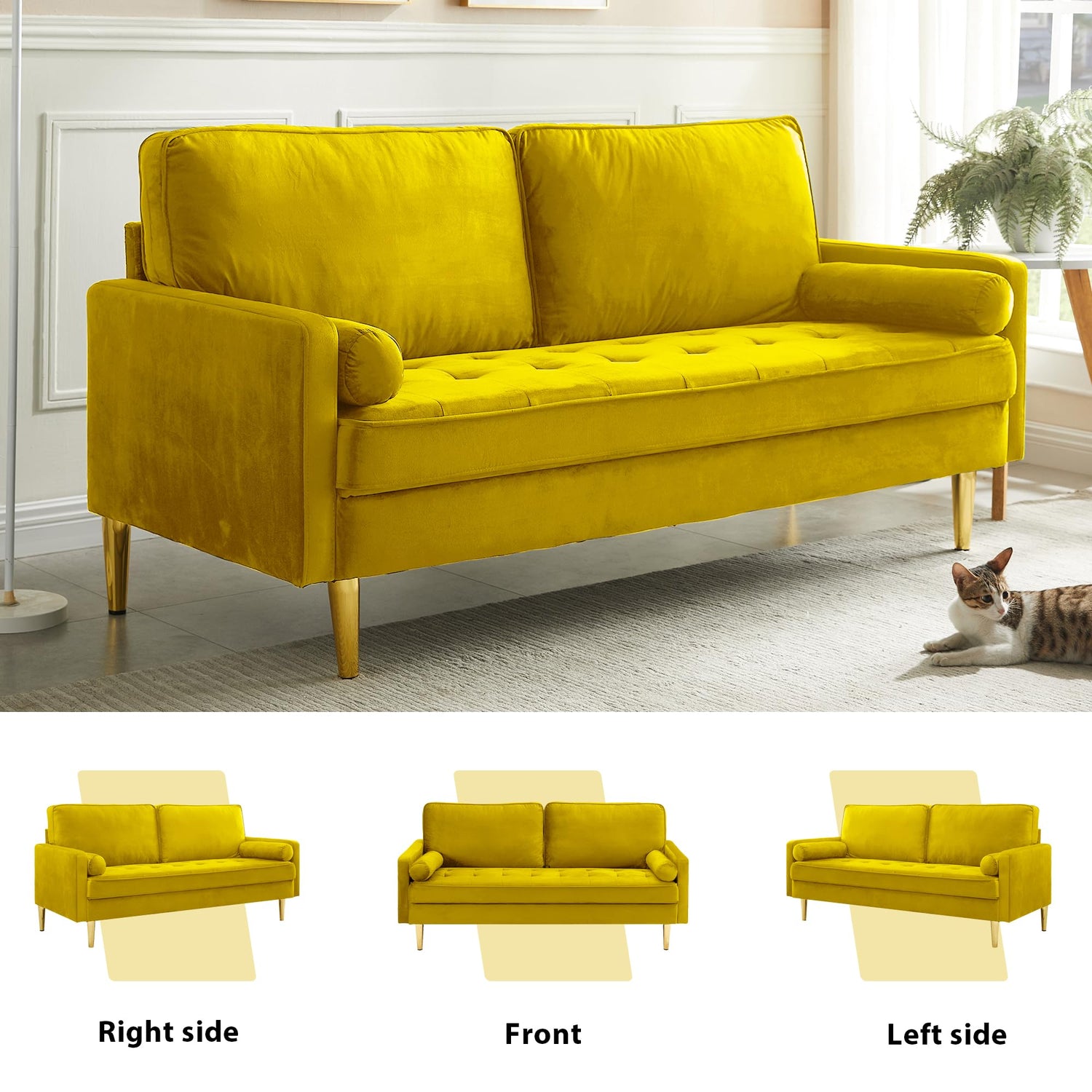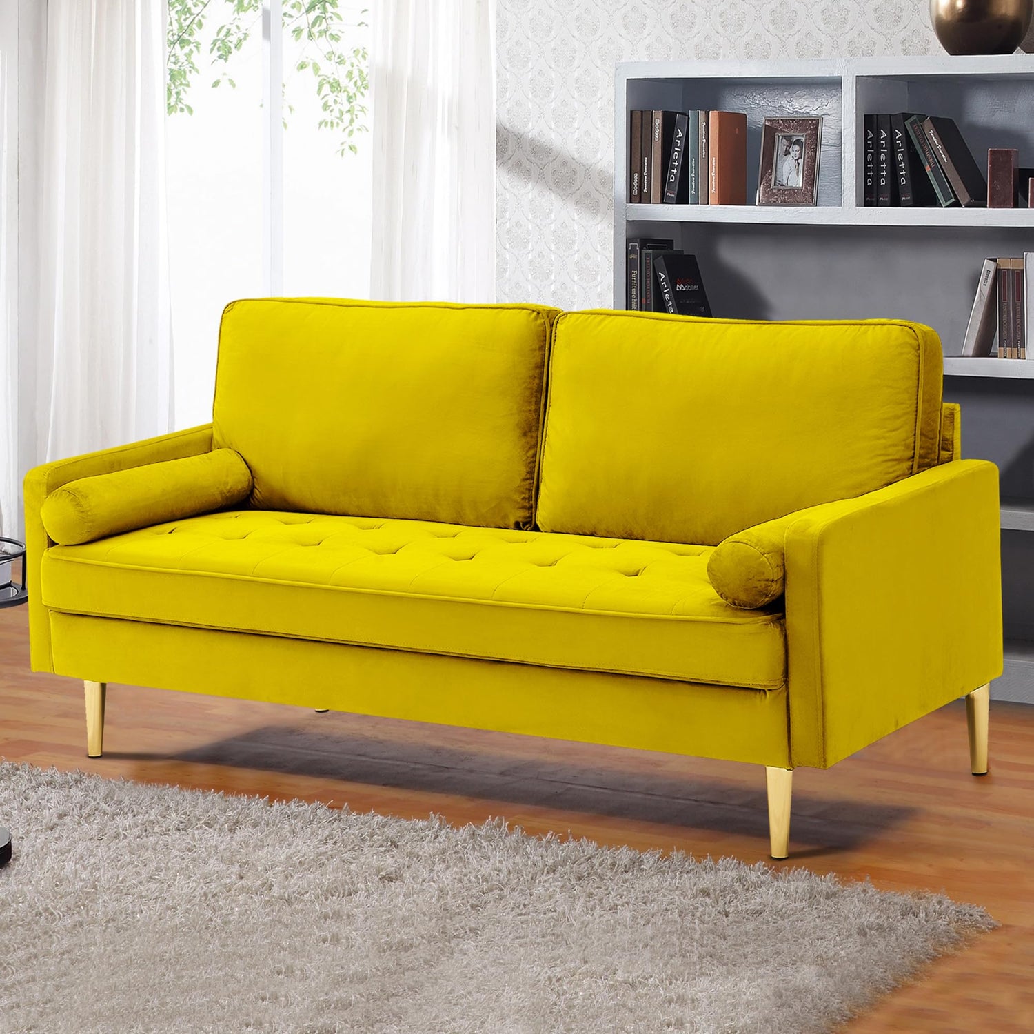 RXRRXY 67" Modern Velvet Loveseat Sofa Couch, Mid-Century Tufted Upholstered Small Love Seat Couch with 2 Pillows & 4 Golden Legs, 2-Seats Couches for Compact Space, Living Room, Apartment (Yellow)