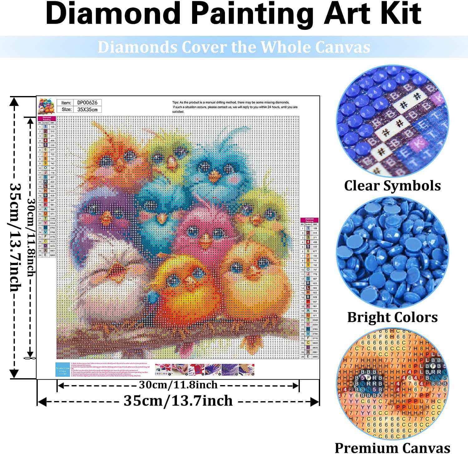 - Premium Quality Canvas:The printing oil canvas is high clear printing and water-proof, the symbols is easy to read. The pattern itself has a hot melt adhesive background and plastic protective film so the diamonds won't fall down once they're pressed onto the canvas