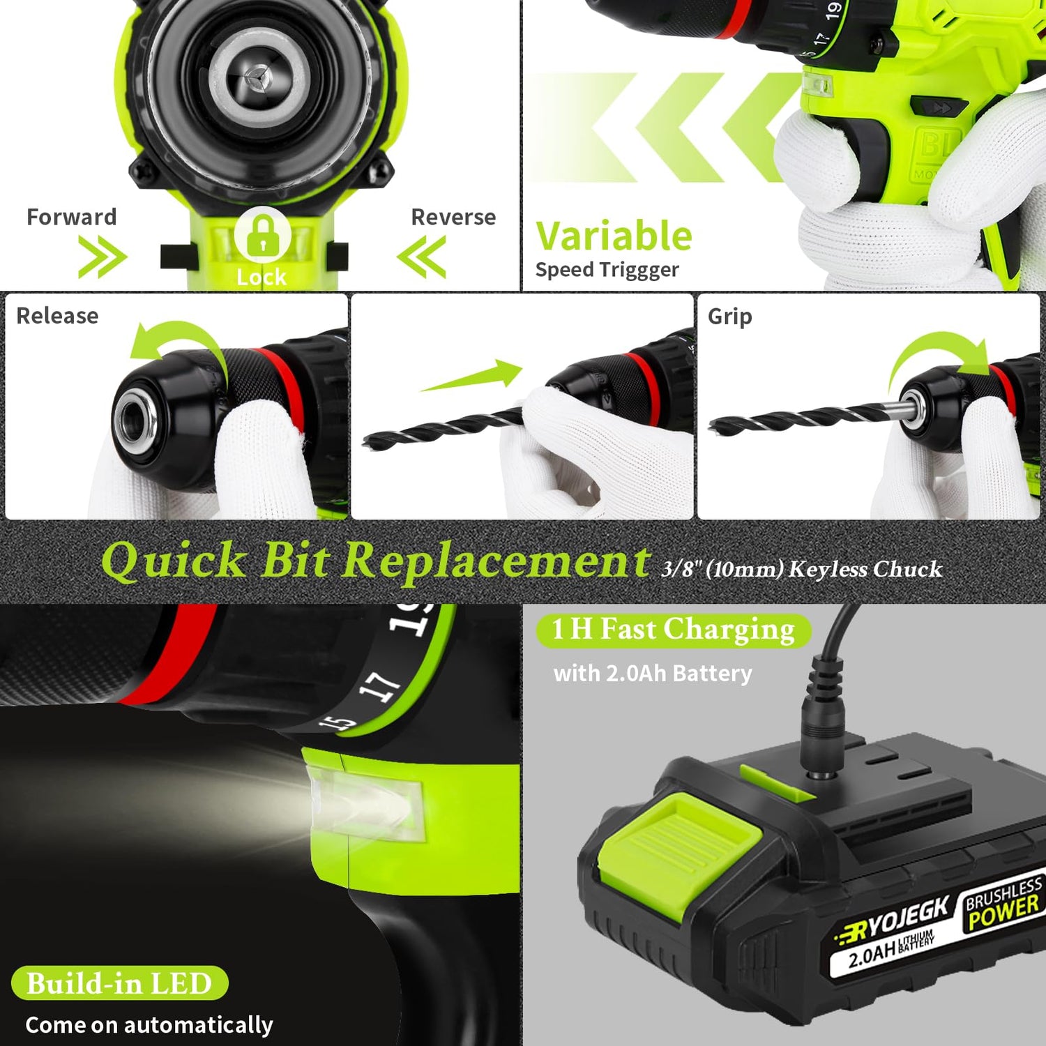 - GOOD FAMILY HELPER - The RYOJEGK drill set not only comes with a 20V brushless drill, but also comes with an extensive 115-piece tool kit, including hammers, saws, wrenches, pliers and tape measures, etc. Whether you're assembling furniture, repairing appliances, or doing simple home improvements, this 119-piece home battery drill kit is designed to provide you with the solutions you need