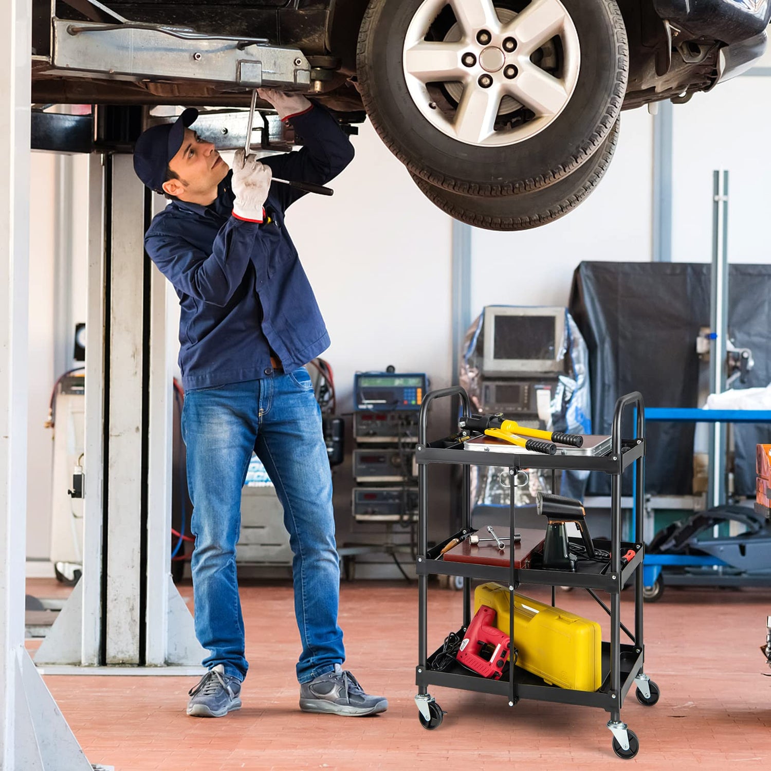 - ✔️【Sufficient Classified Storage Space】Designed with 3 spacious shelves, this mobile garage tool cart can accommodate a variety of screwdrivers, pliers, drills and other tools. There is a 12.5" gap between each shelf, which is suitable for higher items like storage baskets. What's more, each layer has 4 small grooves to help you sort out small tools.