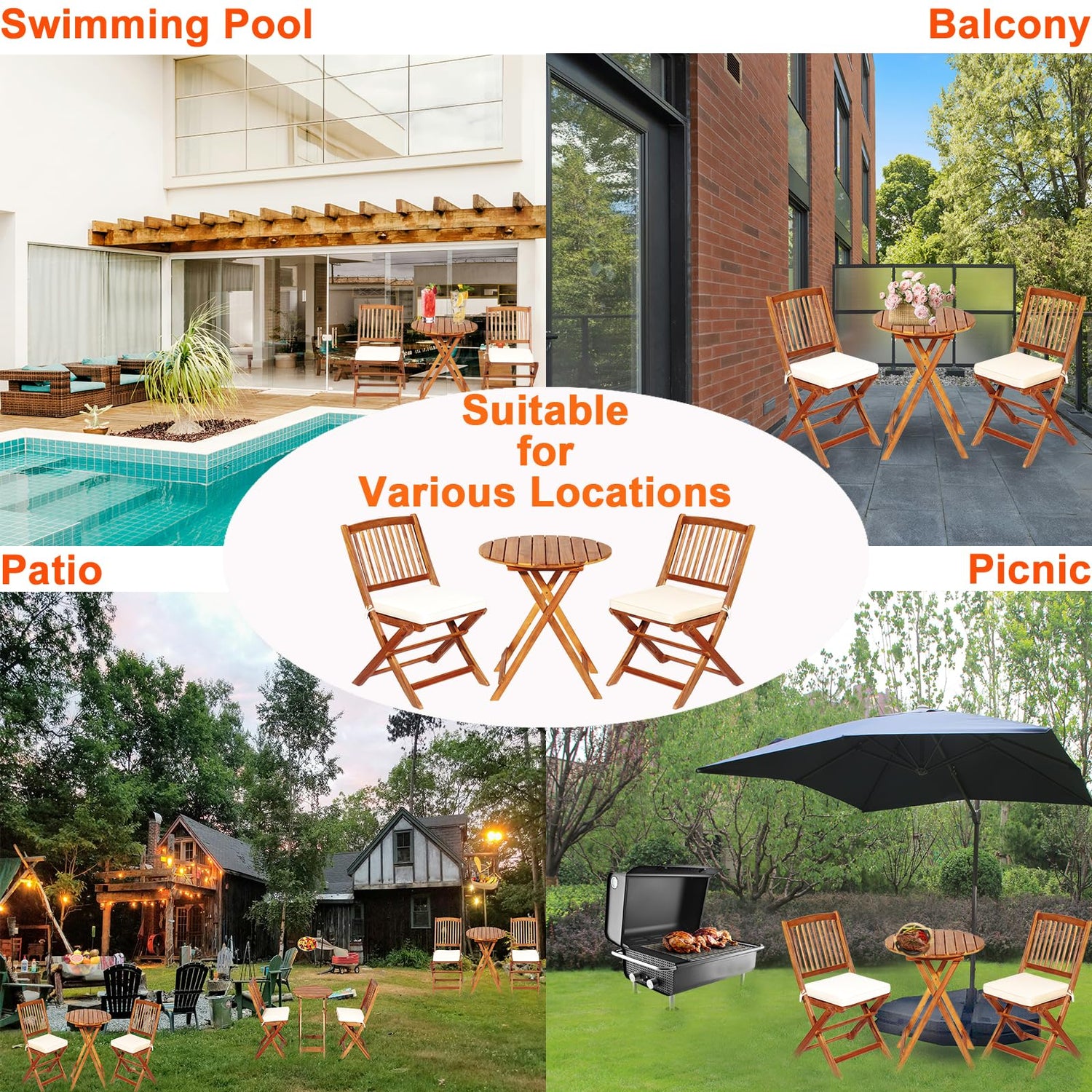 S AFSTAR Bistro Table and Chairs Set of 2, Acacia Wood Folding Bistro Set for 2 with Detachable Soft Cushions, 3 Piece Outdoor Bistro Set for Patio, Balcony, Pool, Garden & Yard (Natural Color)