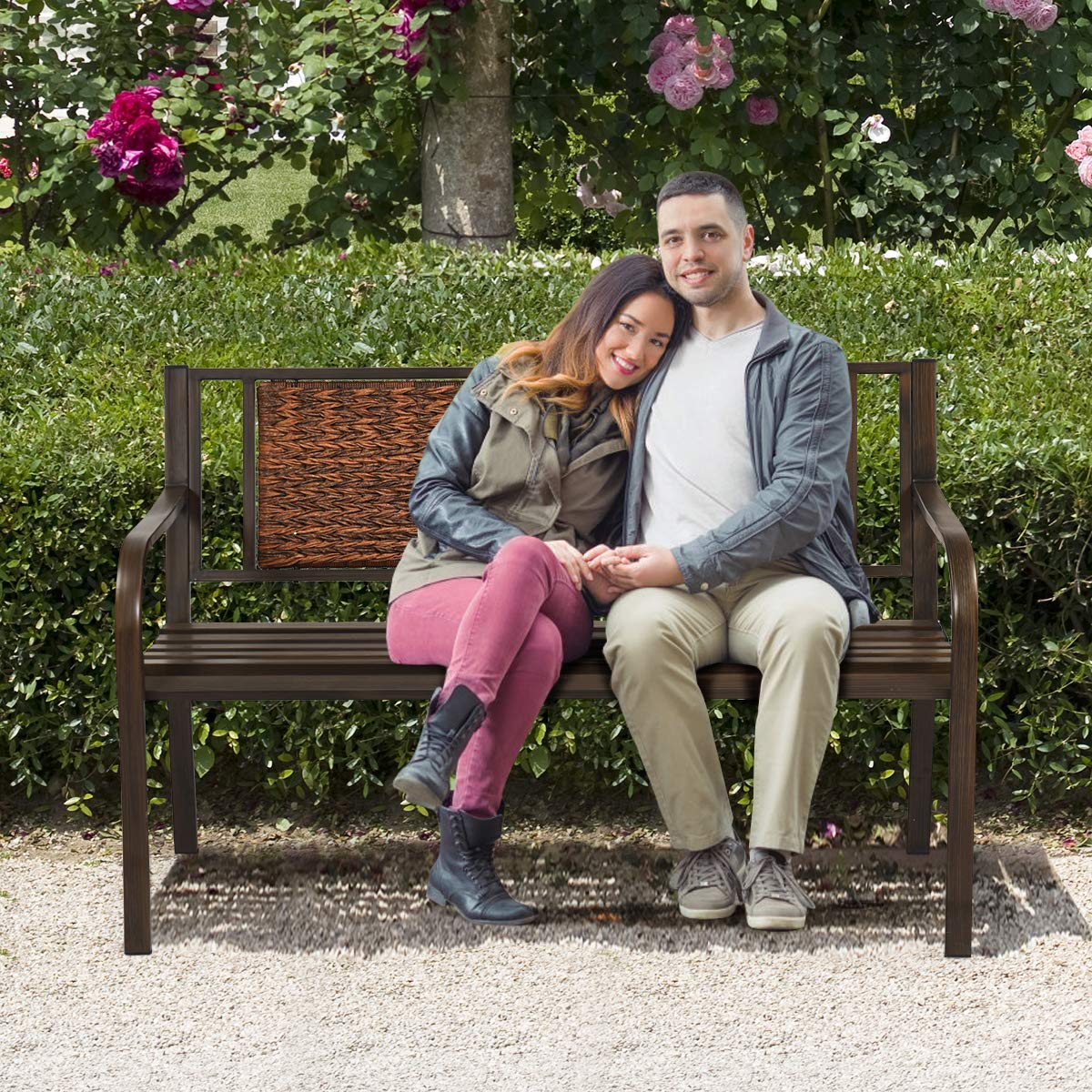 - đăSlatted Design with Smooth EdgesăThe breathable PE backrest and slatted seat will promote air circulation, keeping you feel cool and comfortable even in the hot summer. Polished rounded edges and seat parts are handled with smooth surface for safety use. The garden bench is weather-resistant, water-proof for easy clean and maintain.