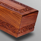 - SPECIFICATIONS & FEATURES: This keepsake urn for adult ashes is a Truly Handcrafted product ensuring each pet urn box is UNIQUE, AFFORDABLE and DURABLE. The Wooden Urn box is handcrafted handcarved with fine detailing. A beautiful eternal wood grain finish that will warm your heart.