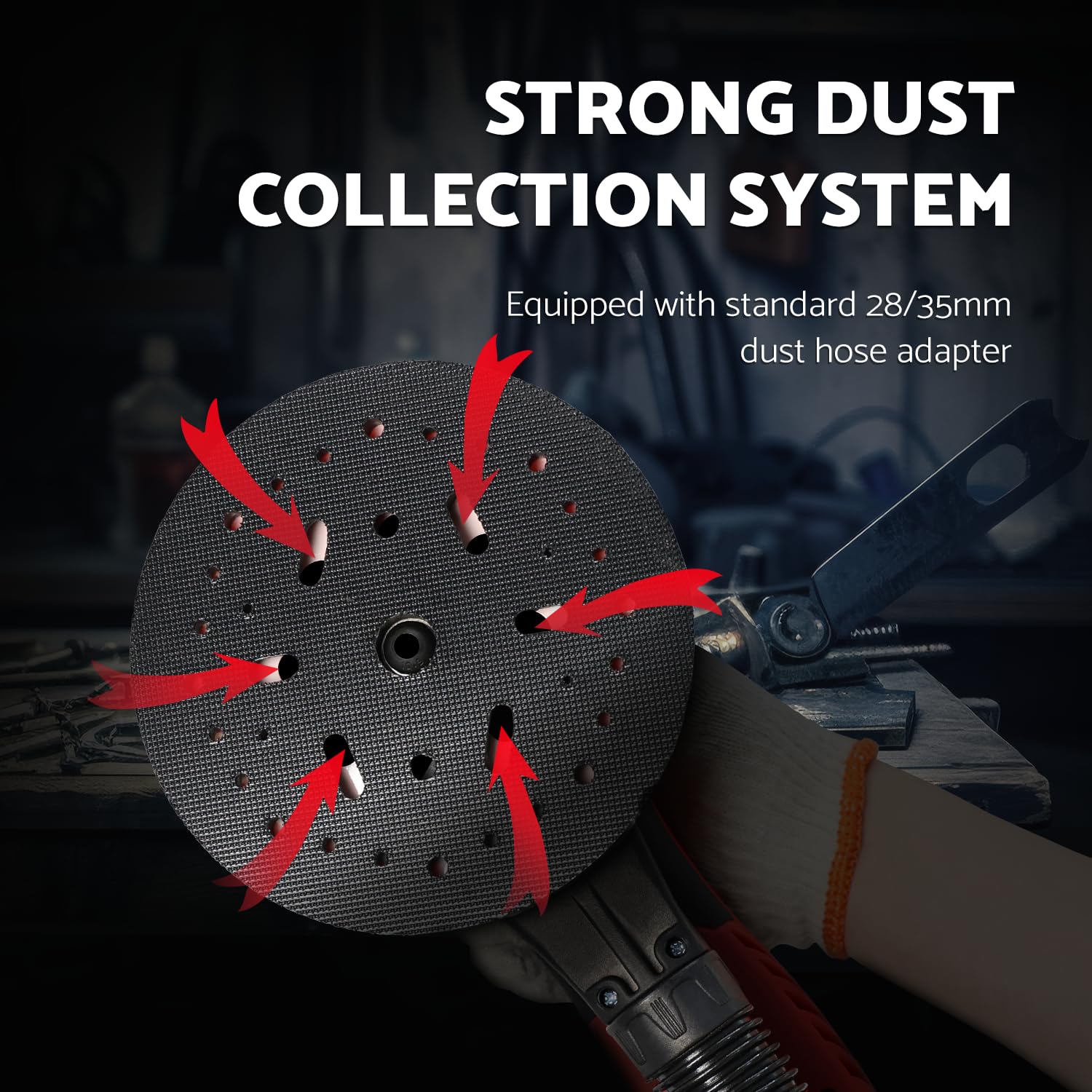 - DUST-FREE SANDING - Enjoy a cleaner, healthier work environment with our dust-free 5 / 6 inch Orbital Sander. The sander comes equipped with a dust hose adapter in standard 28/35mm sizes, seamlessly connecting to most industrial vacuum cleaners.