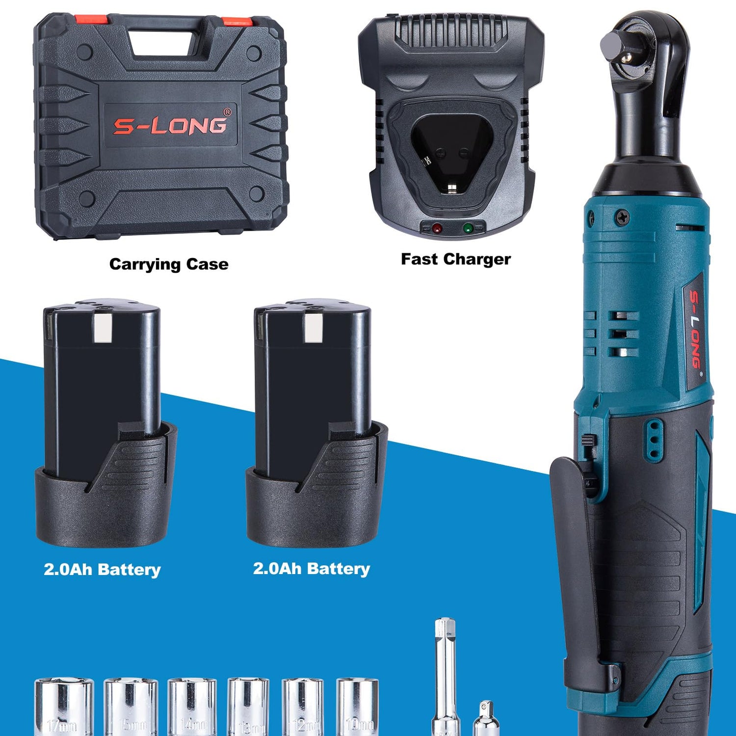 - 【2 Batteries & Fast Charger】: S-LONG cordless ratchet wrench comes with two rechargeable 2000 mAh batteries which can be fully charged in just 1 hour. You can finish your work more effectively