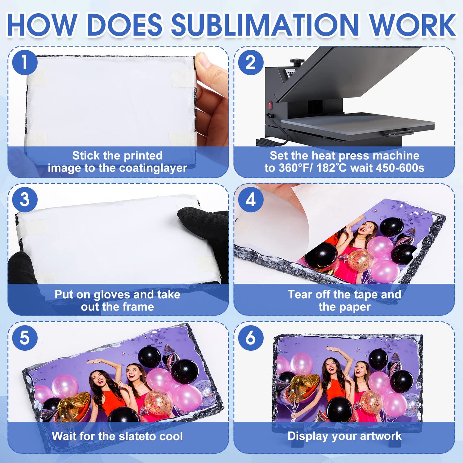 - Easy to Use: first you need to use thermal transfer tape to paste the printed graphics on the sublimation coating of the photo frame, then set the heat press to 360 degrees Fahrenheit/182 degrees Celsius, press and wait for 7-10 minutes, and finally wear glove on to remove the frame, then peel off the tape and paper to get your creation