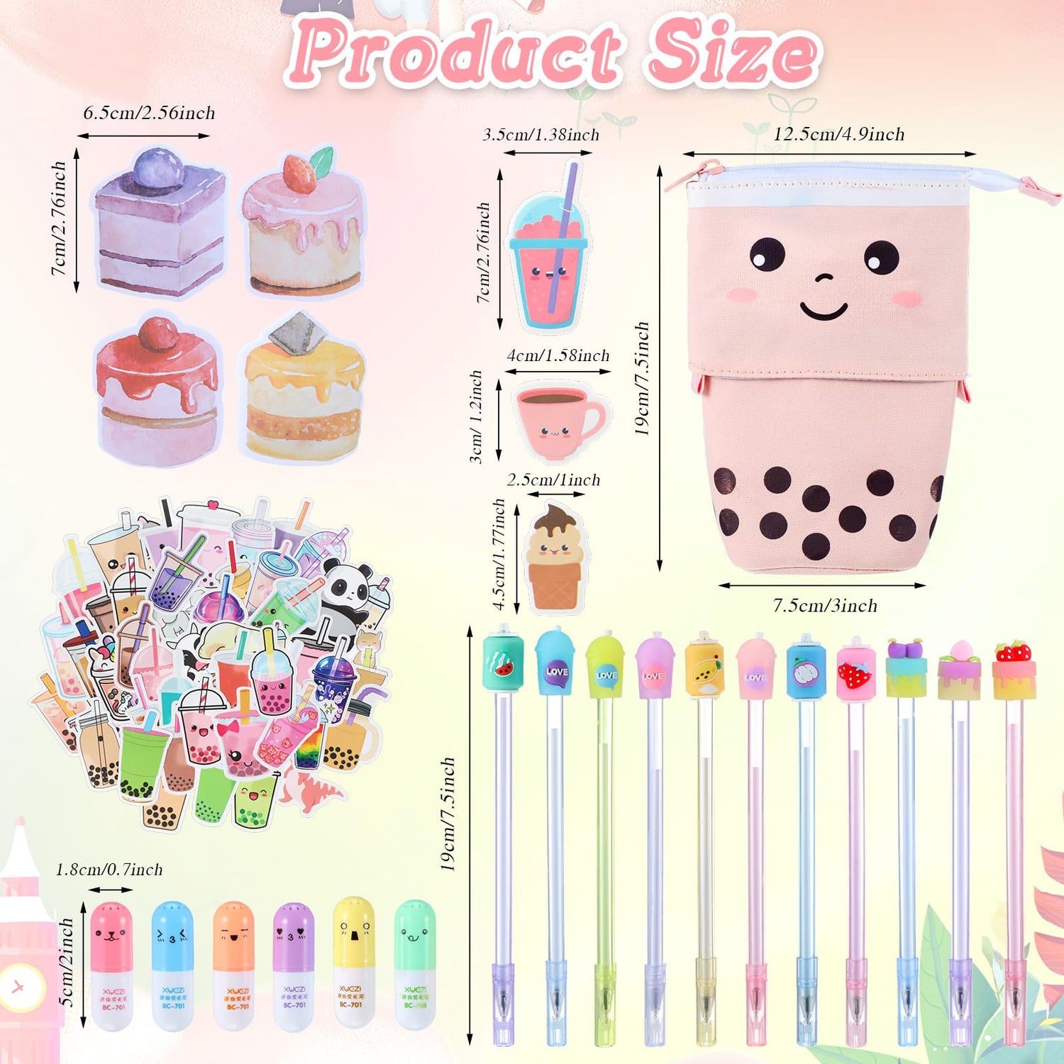 - Kawaii Stationery Set: you will receive a set of milk tea stationery, including 1 telescopic pencil case, 160 cake sticky notes, 11 neutral ink pens, 50 milk tea stickers and 6 pill highlighters, in a total of 228 pieces, sufficient quantity and a good combination of substitutes to meet your needs