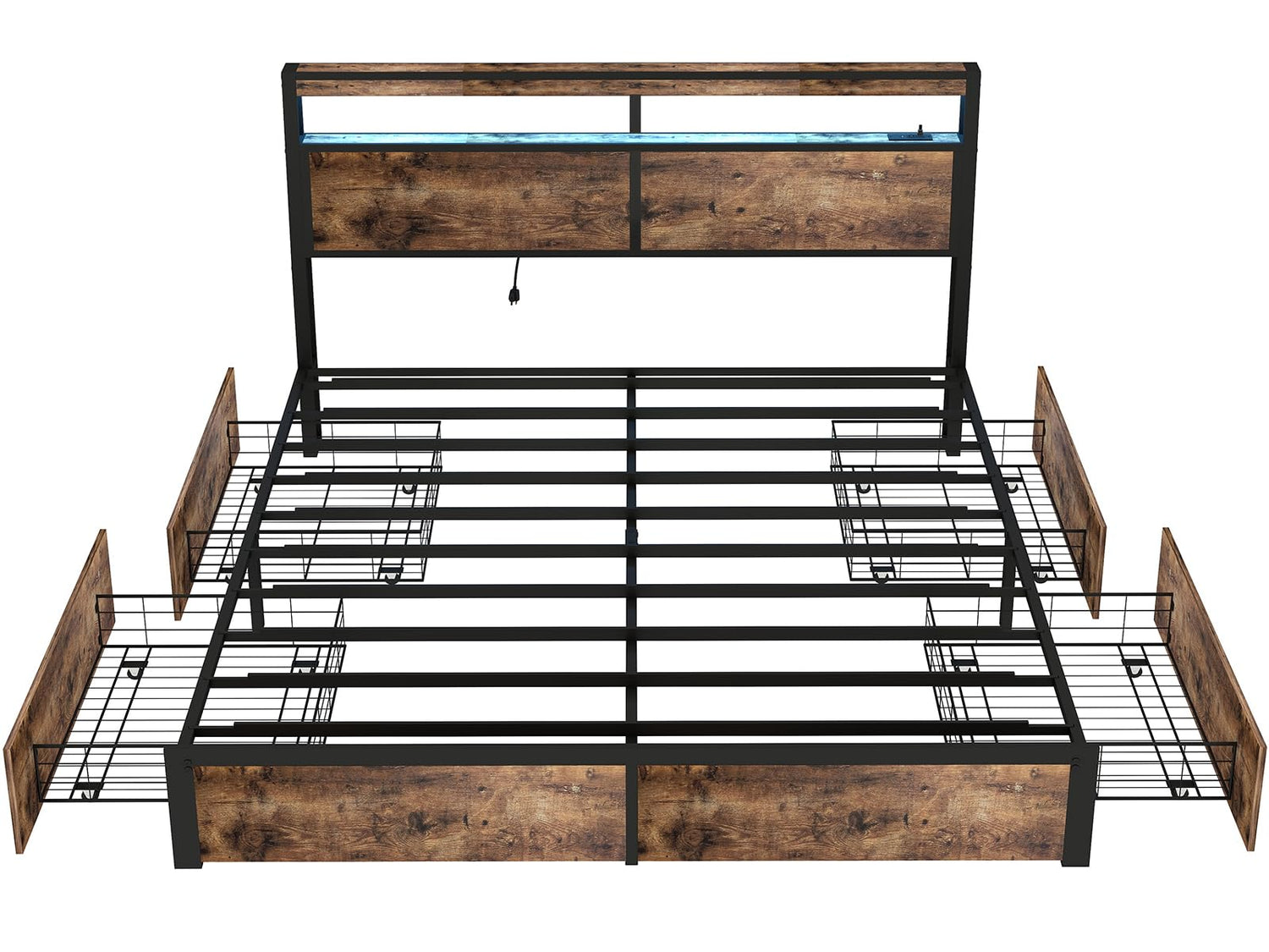 SADENICEL King Bed Frame with Storage Headboard and 4 Drawers, Metal Platform Bed Frame with LED Light, Charging Station, No Box Spring Needed, Noise Free, Easy Assembly, Vintage Brown