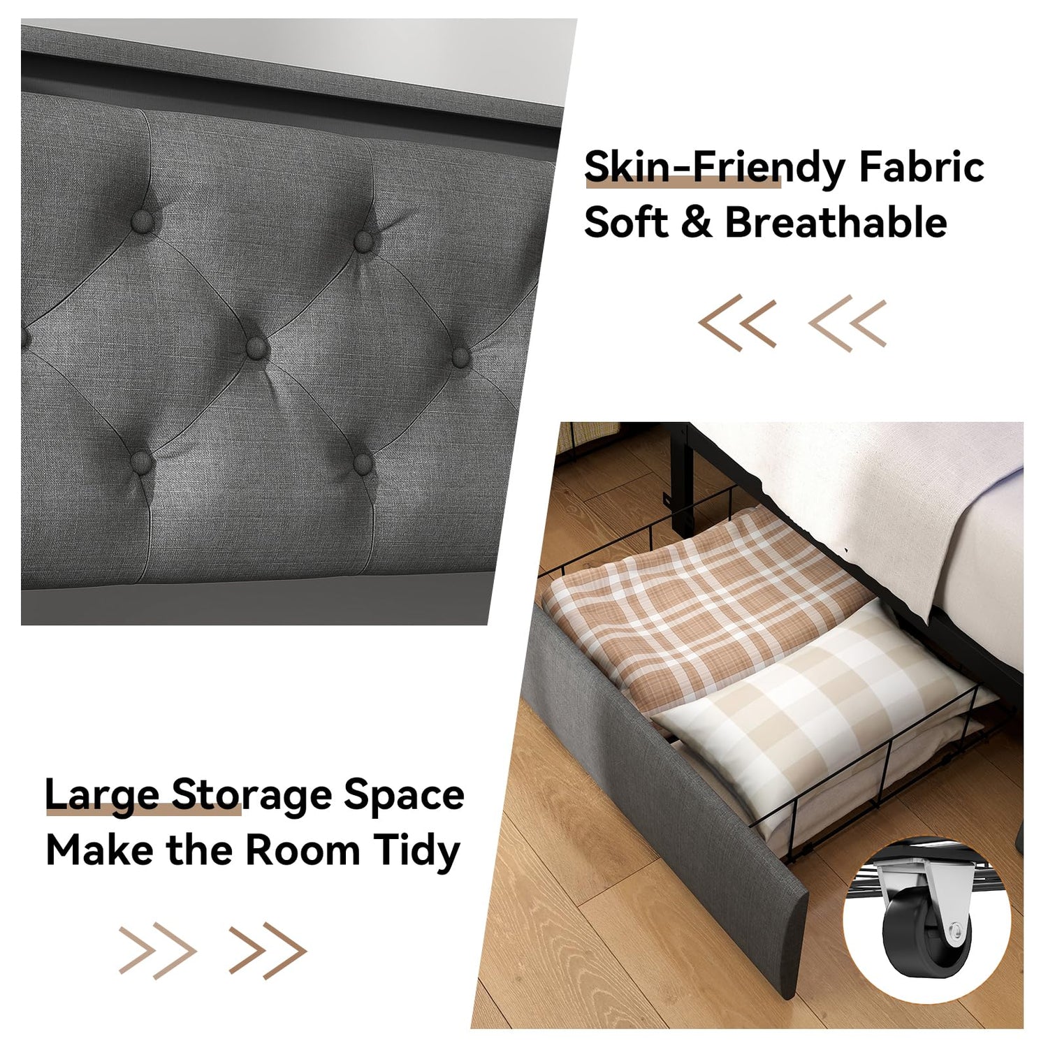 - 【Skin-Friendly Fabric & High-Density Sponge】The upholstered platform grey bed frame is decorated with linen fabric, the headboard is finished with button tufting and square stitching, skin-friendly, breathable and wear-resistant, adding a sophisticated style to your bedroom. 1.2" high-elastic memory foam, providing you with soft support. Stylish and fully functional, perfect for modern bedrooms.