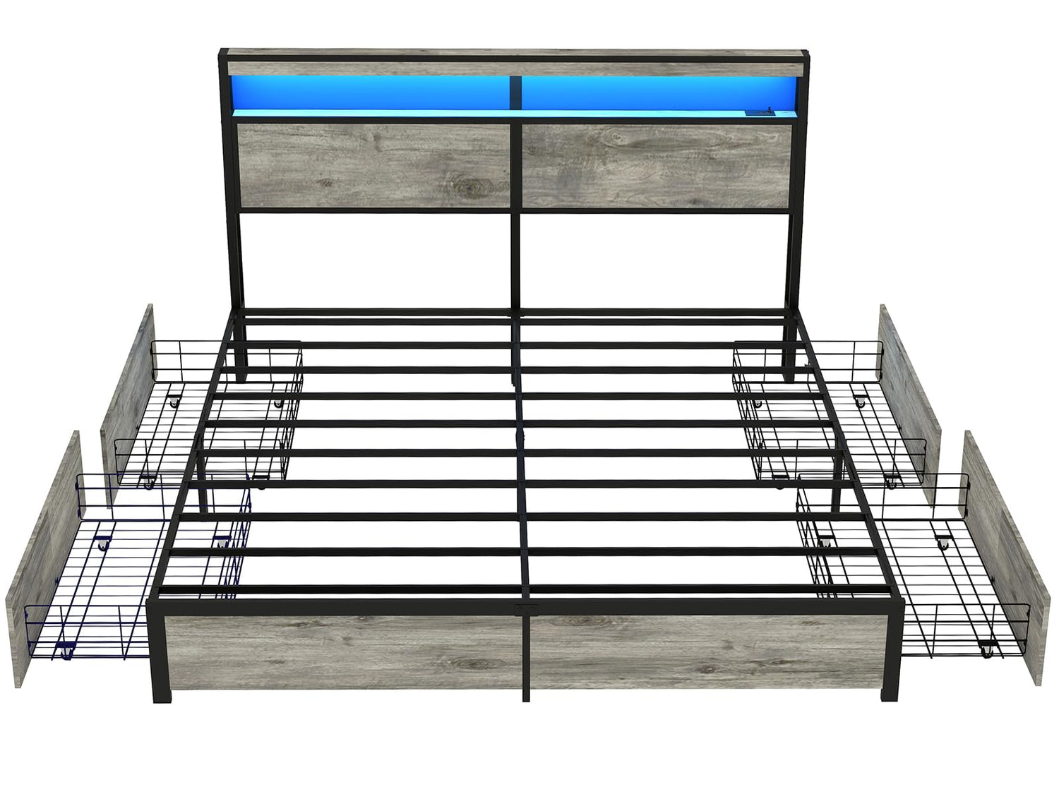 SADENICEL King Size Bed Frame with Storage Headboard, Metal Platform King Bed Frame Wood with 4 Drawers, LED Light, Charging Station, No Box Spring Needed, Noise Free, Easy Assembly, Grey