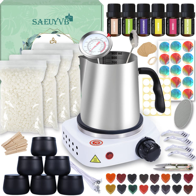- 【Luxury Candle Making Set】 The carefully packaged set includes:1*electric stove,1*900ml large candle melting pot,4*150g soybean wax,6*5ml bottle essential oil,16* colored candle dyeing blocks,6*4 ounces beautiful candle tins,4*stainless wicks center devices,1*Thermometer,20*Candle wick stickers,20*15cm candle wicks,1* Mixing spoon,20*Warning stickers , 20*wooden center devices,6*gift tags,1*u-shaped scissors,1*anti Scalding Pad and instructions