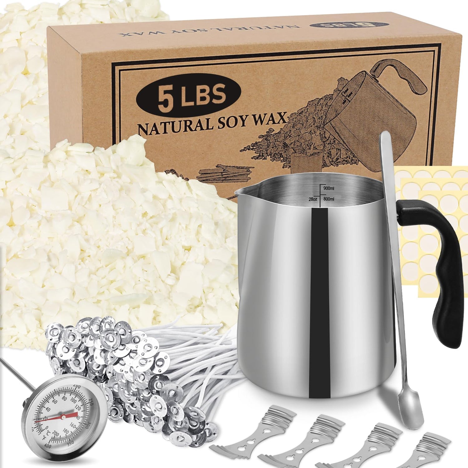 - 【Perfect Candle Making Kit】Our candle making kit for adults contains everything needed to make homemade candles: 5lb soy candle wax x1, 900ml 304 Stainless Steel Candle Pouring Pot x 1, 3.9'' Candle Wicks x50, Candle Wicks Sticker x60, Stainless Steel Wicks Holder x4, Spoon x1 , Thermometer x1. Our largest candle kit comes with 5 pound wax flakes, which can meet your various DIY needs.