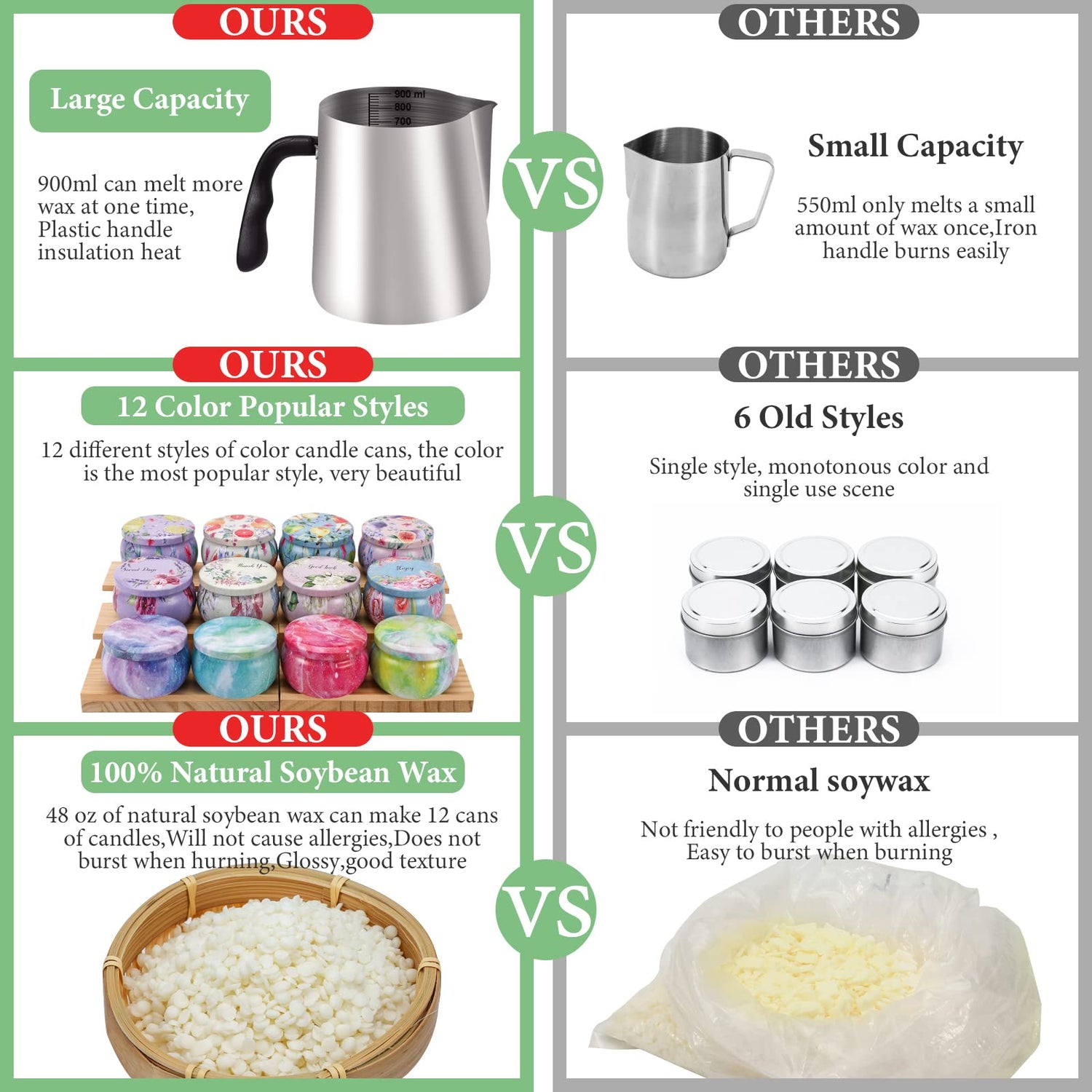 - Tips-We are upgrading the bags for soy wax from 8 small bags to 2 large bags. The manual will also be updated to make it easier for you to make candles. It should be noted that this requires a process, but we will actively solve any problems encountered.