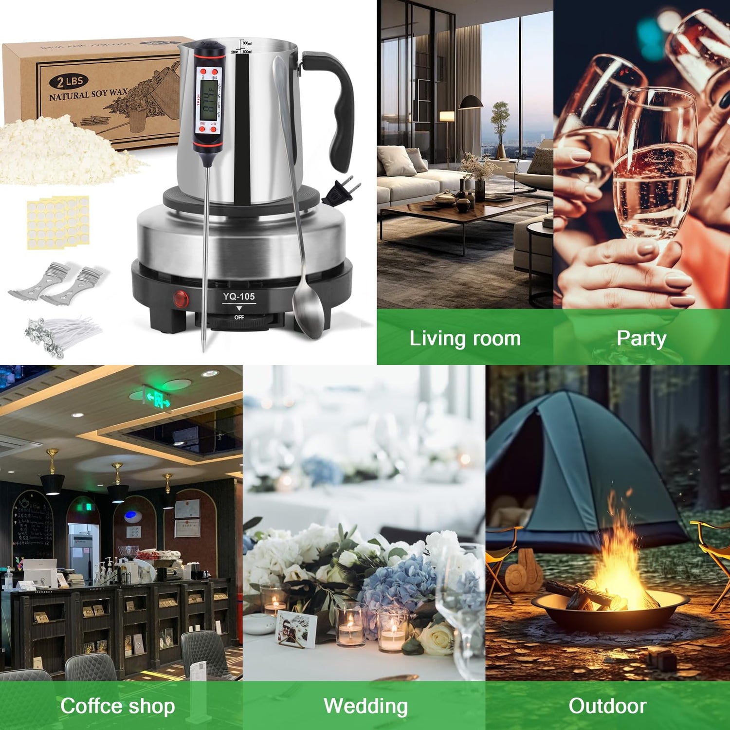 - đăCandle Making SuppliesăCandle Making Kit Includes electric hot plate for candle wax melting, 2lbs of organic soy candle wax, 50 cotton candle wicks, 1 stainless steel pouring pot, 2 stainless steel centering devices, 1 stainless steel spoon, 60 candle wick sticker,1thermometer. DIY candle making kit supplies suit for beginners.