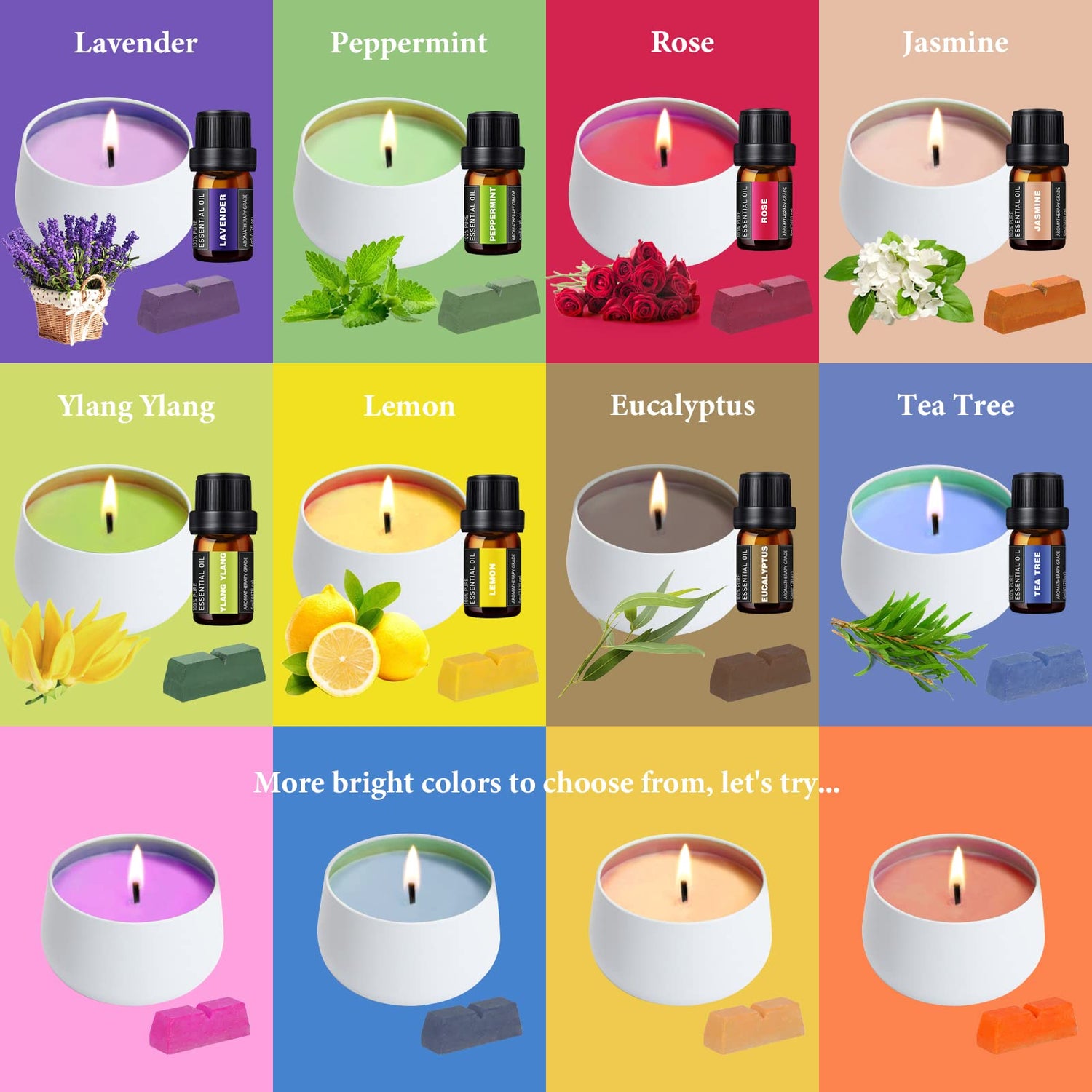 - 🎁【The Perfect Fragrance And Color For Your Home】 Our candle making kits are available in 16 candle jars 8 Optional scents with 12 color dye blocks too so you can not only pick the scents you like best, you can pick the colors too and add up to 4 different dried flowers for decoration - lavender, osmanthus, rose, jasmine-buds.