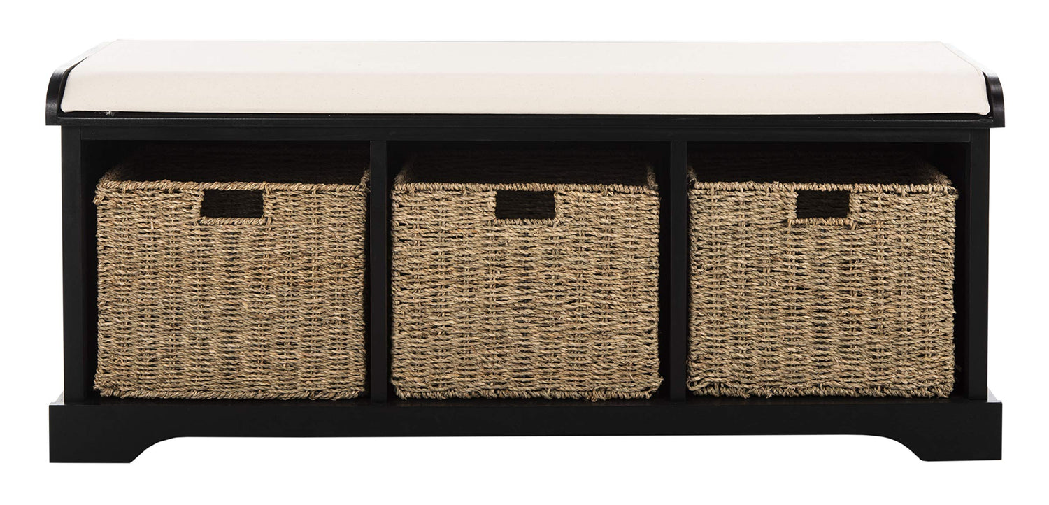 Details: Have a seat! The Lonan storage bench is the perfect perch for removing boots or garden shoes in an entry hall or mud room. Crafted of pine in a handsome black finish, this useful piece has three removable storage bins of woven wicker.