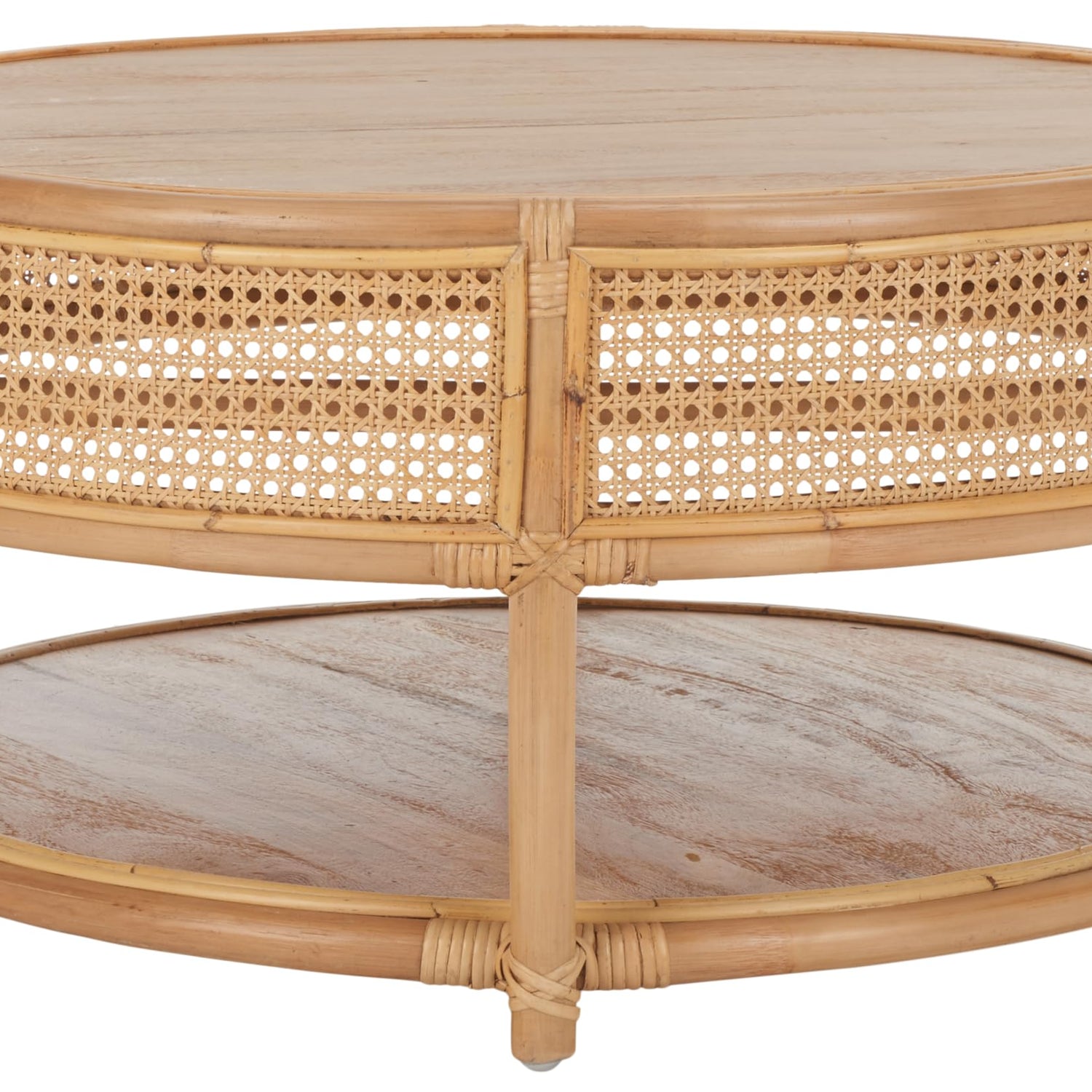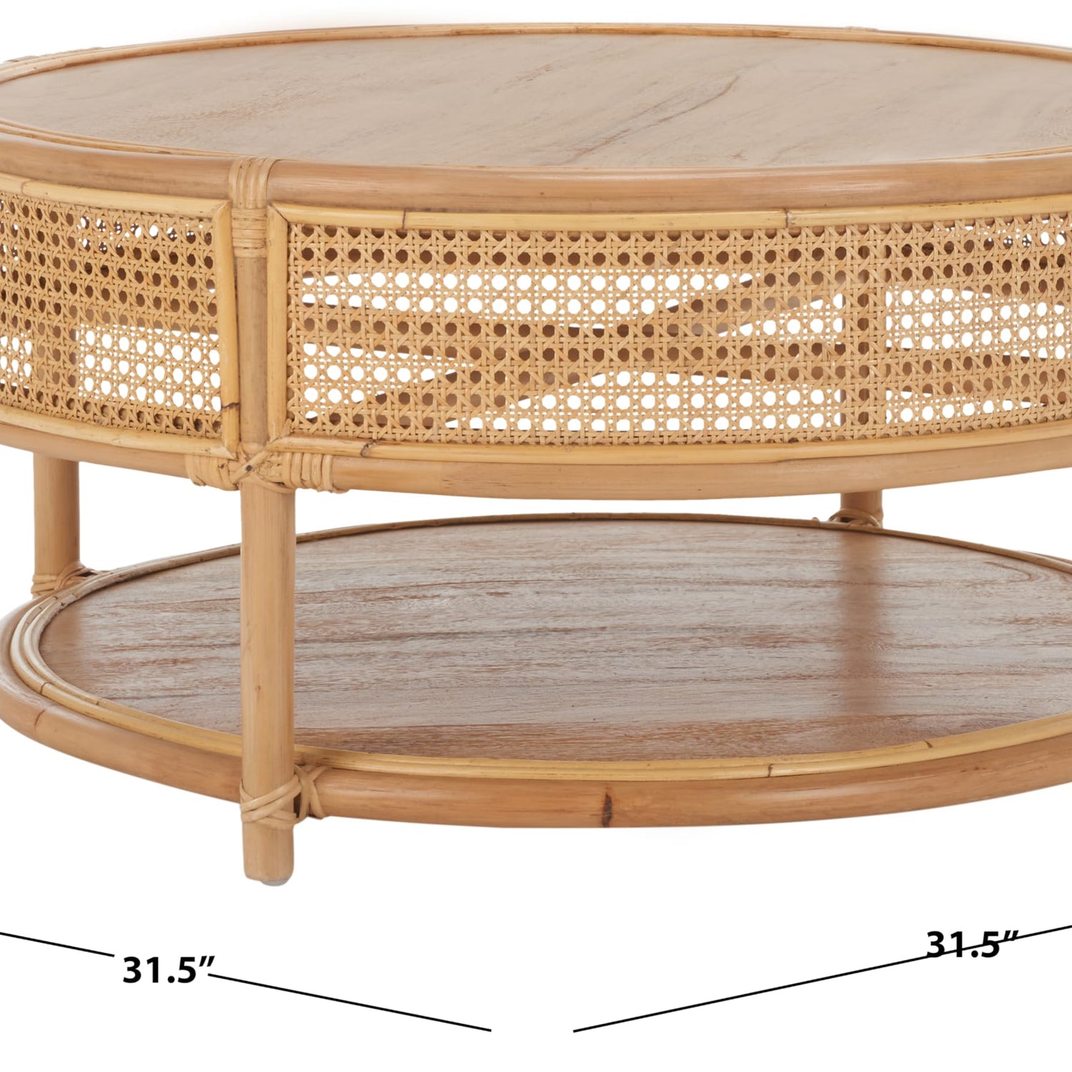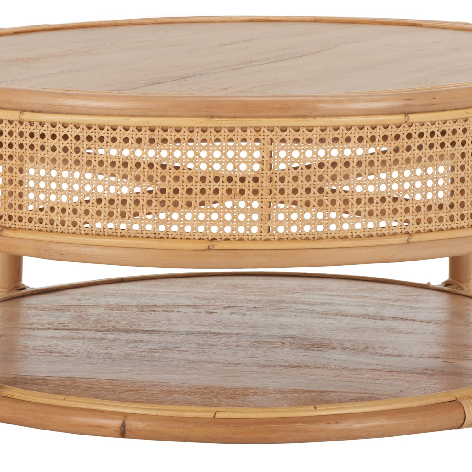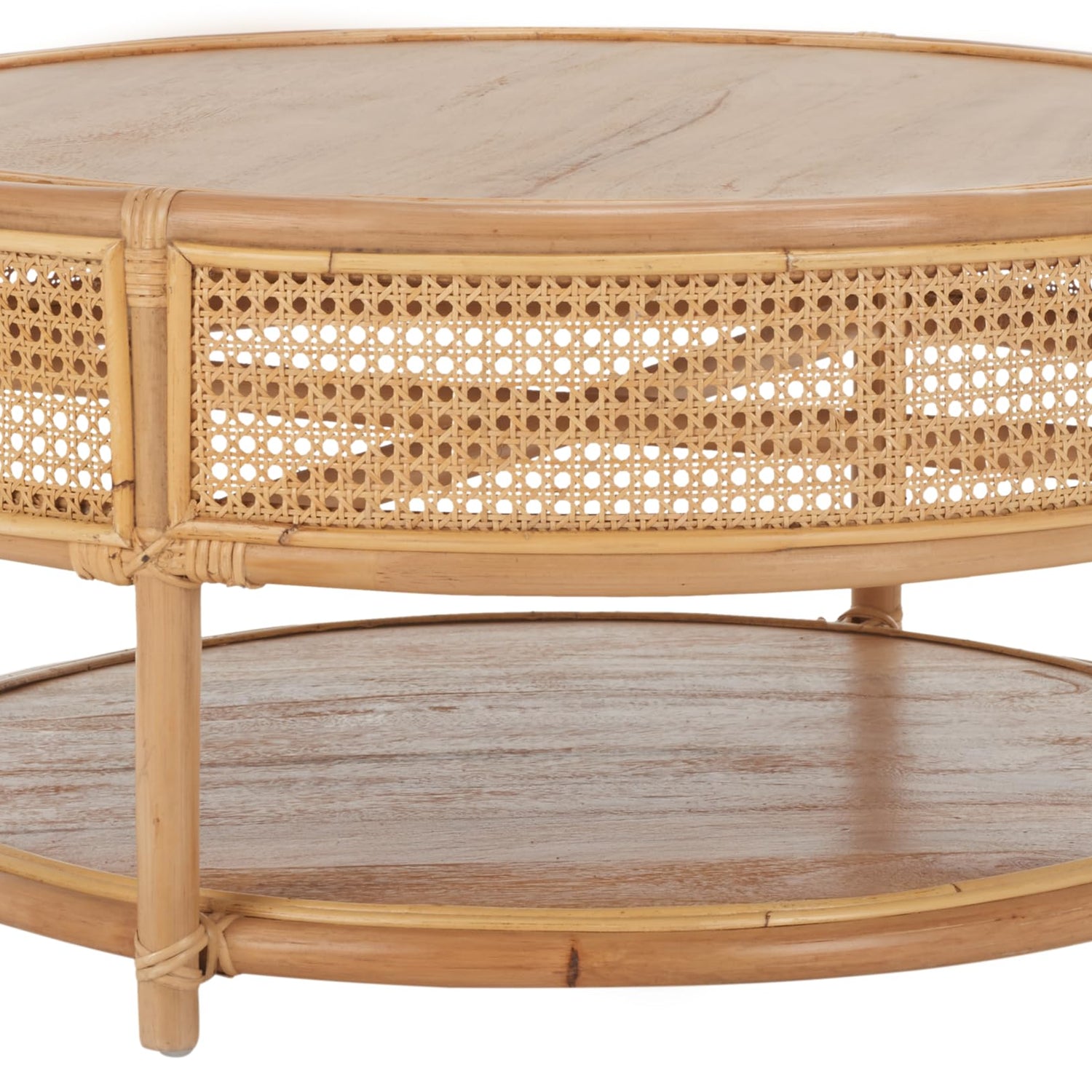 Details: Refresh your space with the warm and breezy presence of our Arvid coffee table. The modern and airy profile of our two-tiered table is updated with rich textures of rattan. The round coffee table is surrounded by a breezy mesh and stands upon rattan poles to attain a charming and inviting presence. The tabletop and a shelf underneath showcase a richly textured surface to elevate your favorite decor. Both practical and charming, our coffee table creates an inviting spot to gather around in your living space and bedroom.