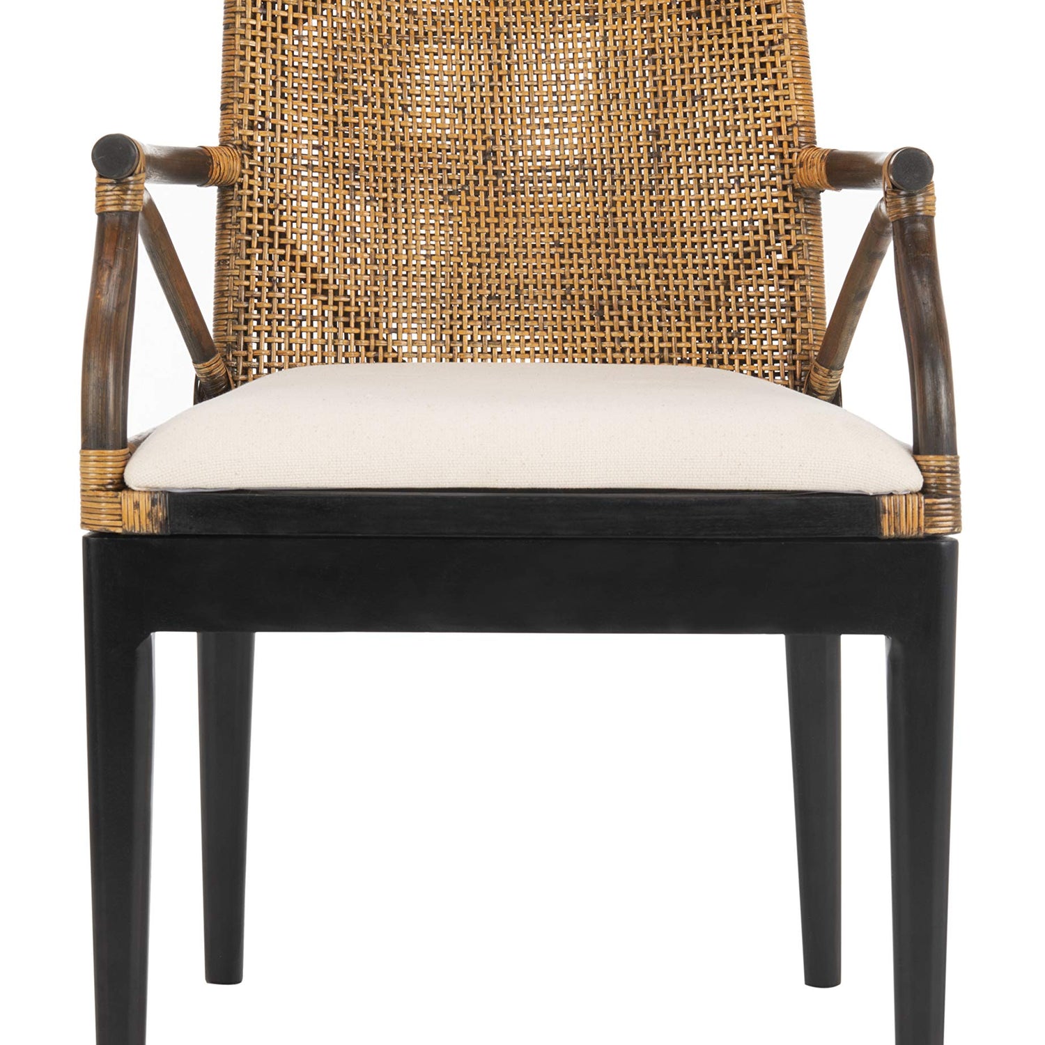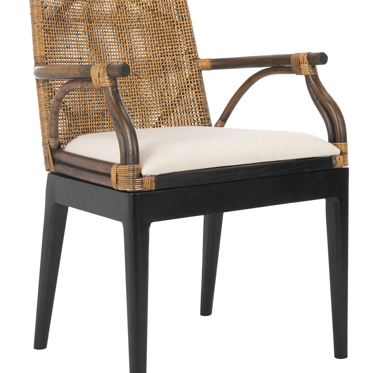 Details: The contemporary lines and mixed materials of this arm chair pay homage to traditional and nature-inspired designs alike. Gently curved arms crafted with rattan and rawhide lacing sit atop ebony mahogany legs that support its ample cream cotton cushion.