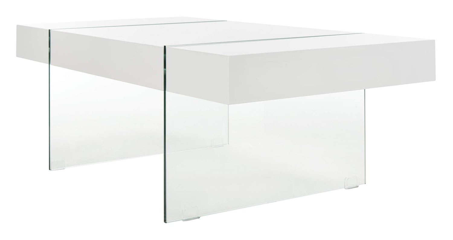 Details: A juxtaposition of ethereal and substantial style, this rectangular glass leg modern coffee table makes an artistic statement. Inspired by contemporary architecture, its translucent glass and sleek white finish are ideal for the minimalist living room.