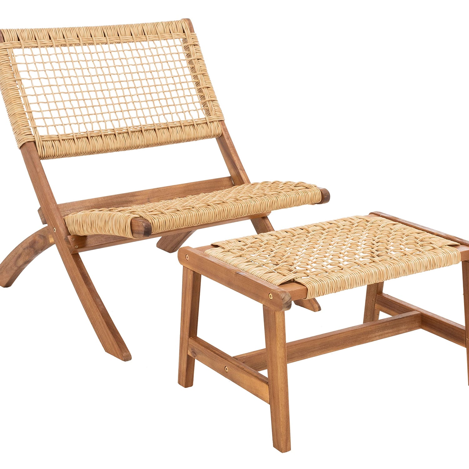 Details: This Casella Set allows you to stretch out and enjoy the summer breeze with ease and style. Two natural finished acacia wood chairs and matching ottomans allow for lavish lounging in the sunshine, and an end table provides ample space for coffees, cocktails, or snacks.