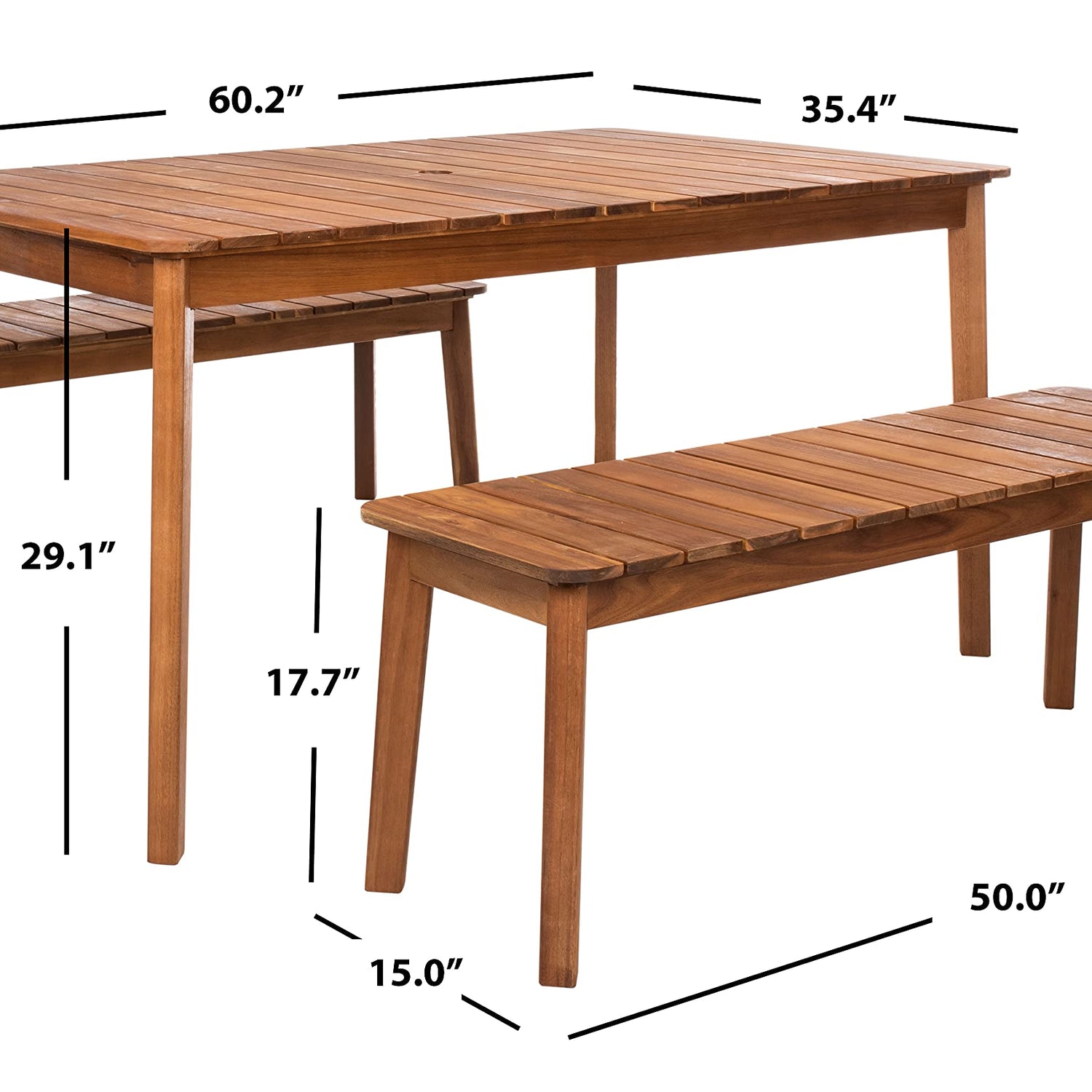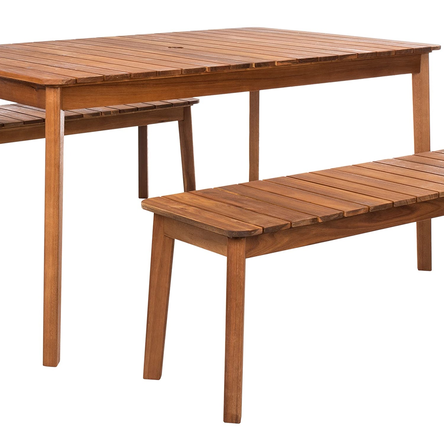 Details: This outdoor Europa Dining Set flaunts its sophistication in the straightforward clean lines and rich natural acacia of its two benches and dining table, featuring an opening for an umbrella to keep you shaded while you dine with friends and family. Perfect for backyard entertaining.