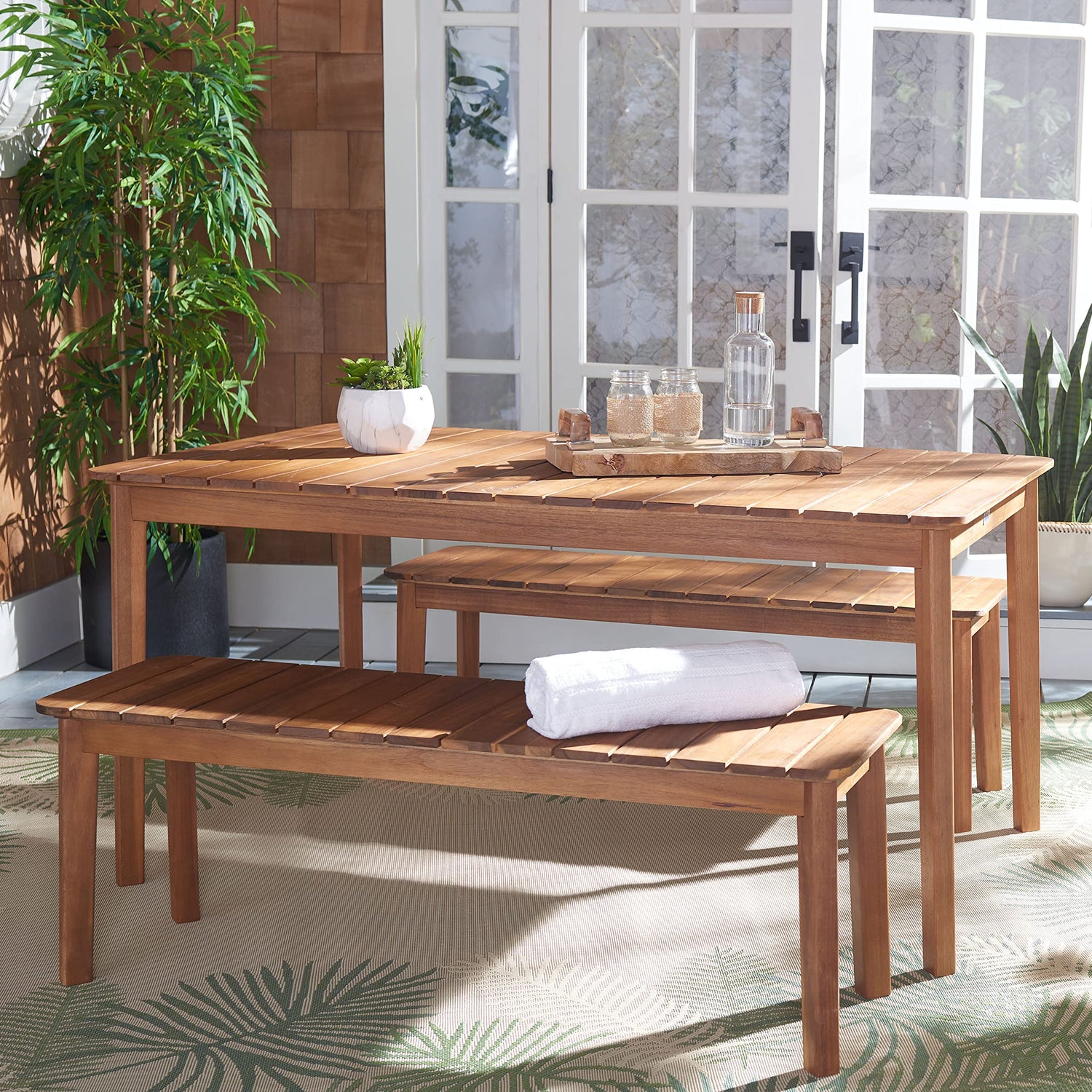 - [CHIC DESIGNER DETAILS]: Add a chic touch of style to the patio, backyard, porch, sunroom, deck, or terrace with this 3-piece outdoor set; Includes two (2) benches and one (1) table with convenient umbrella hole