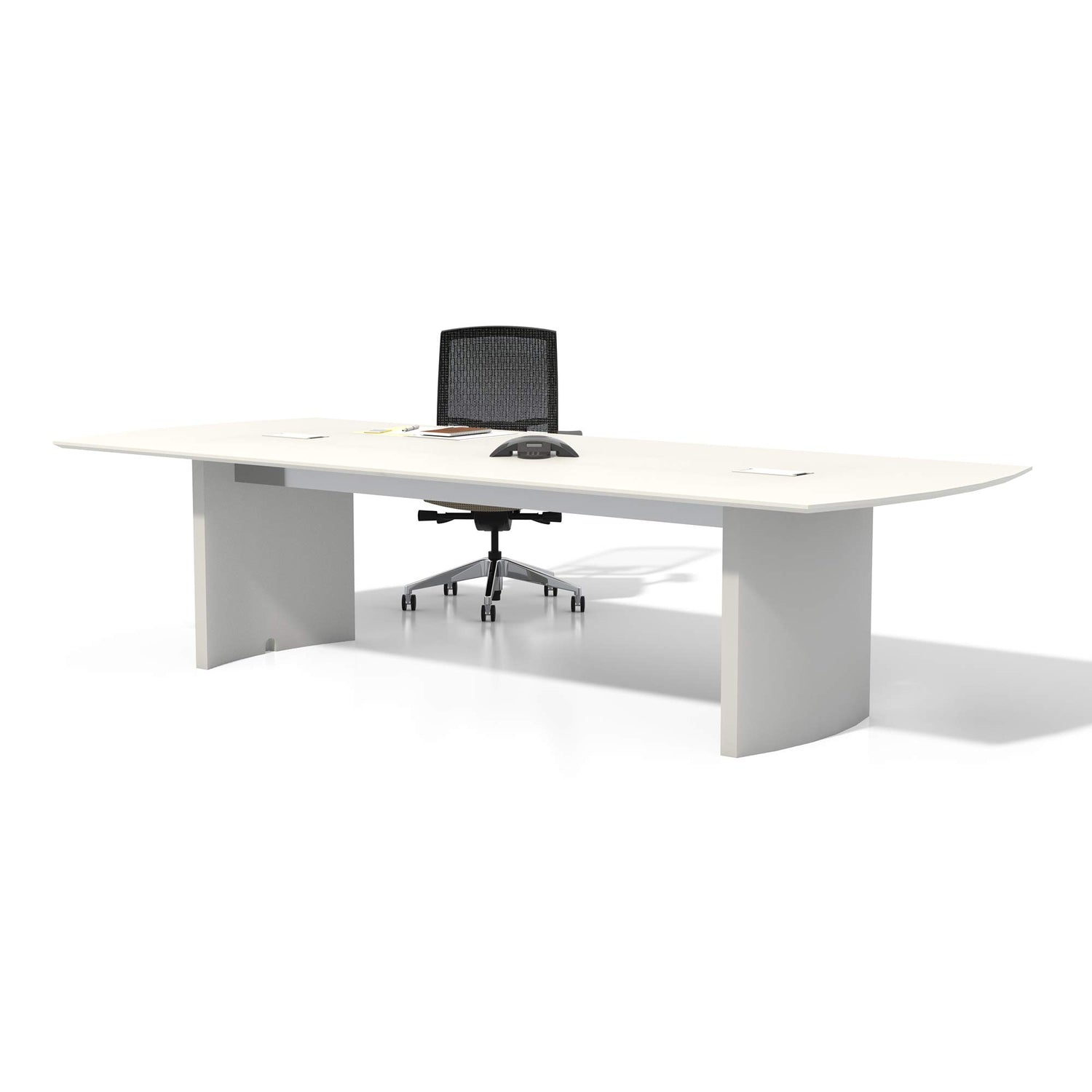 - SLEEK AESTHETIC. Curved ends and beveled edges on the 1" thick tabletop set a stylish yet professional tone for your meeting room. Silver detailing on the grommet hole covers and lower center panels adds just the right amount of modern edge.