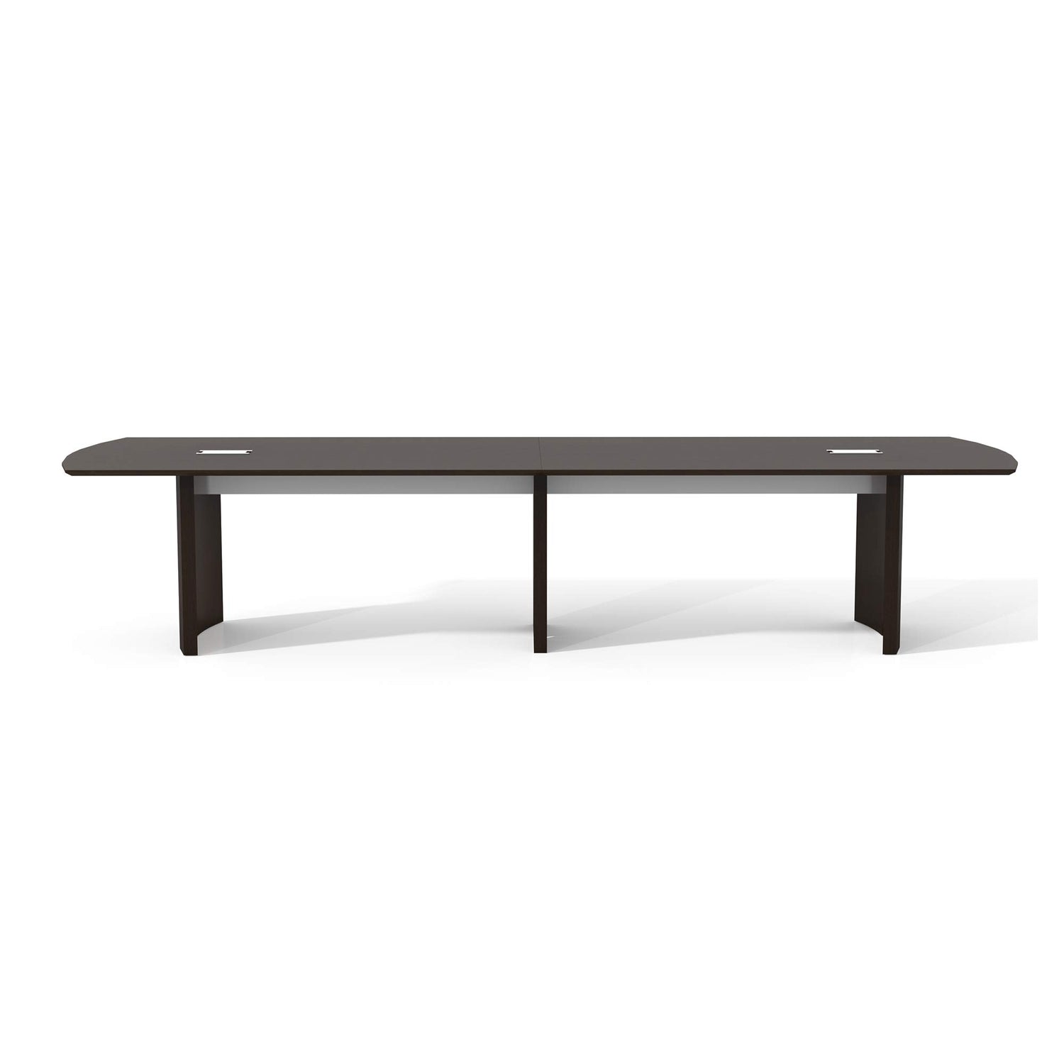 - SLEEK AESTHETIC. Curved ends and beveled edges on the 1" thick tabletop set a stylish yet professional tone for your meeting room. Silver detailing on the grommet hole covers and lower center panels adds just the right amount of modern edge.