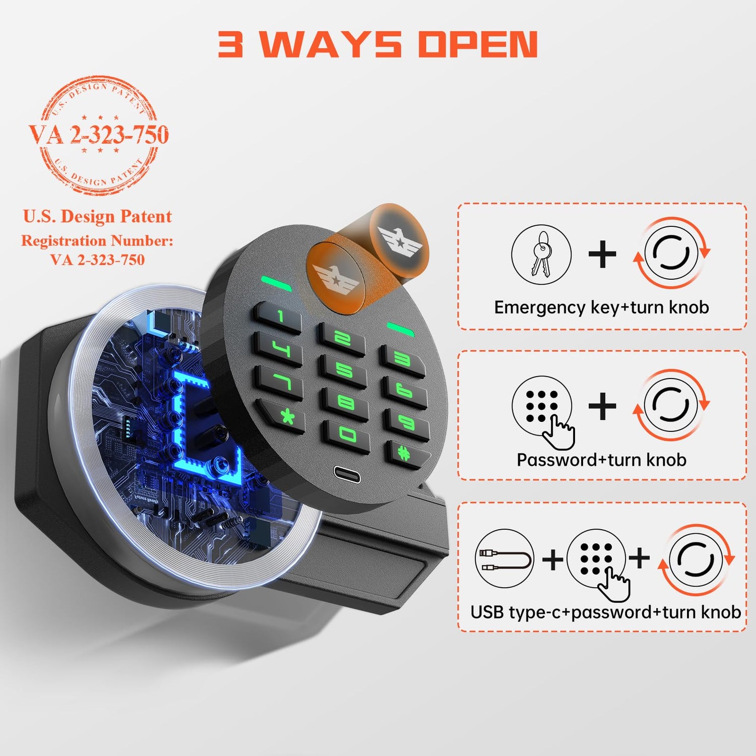 - 【Backlit Keypad, Built-in LED Light & Mute Function】 Backlit keypad can let you easily see and operate the password clearly even in the dark; When you open the safe with password, the led light will on automatically, you can quickly find what you want. Mute function is also necessary for you when you want to open the security safe without making a sound, will not disturb your family or remind intruders.