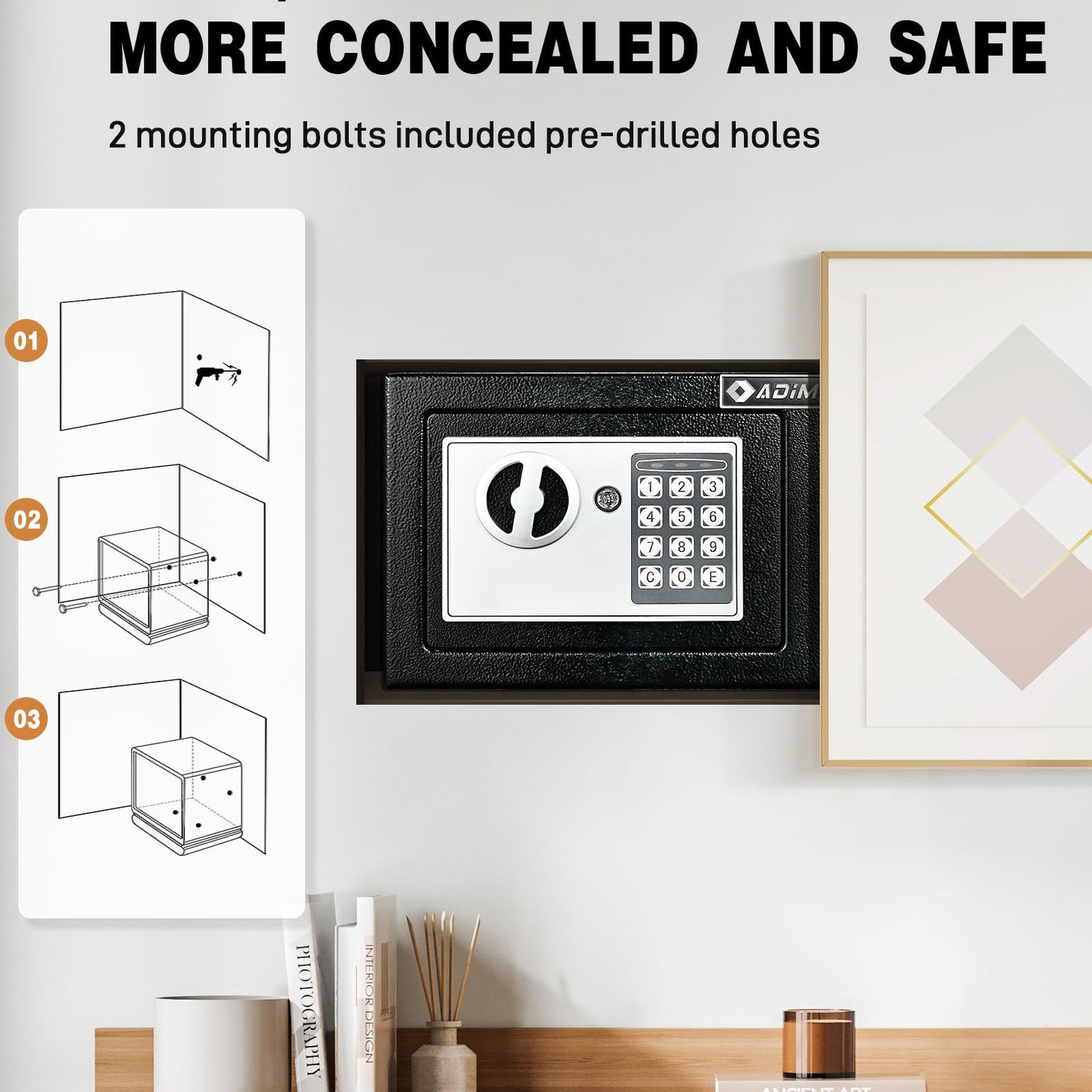 - 【Multi-scene Use】The digital electronic password safe with two bolts, package contains screws for fixing use, you can fix the hidden safe box on walls, floors, or cabinets, and also be used as a portable money box. Suitable for home, office, hotel, and other places as a storage device like a wall safe to protect your valuables.