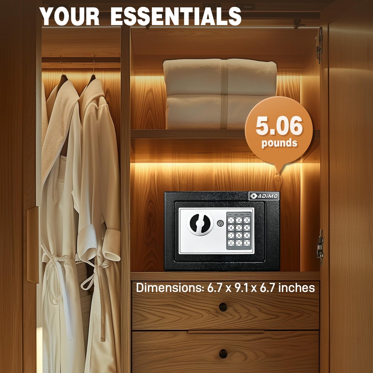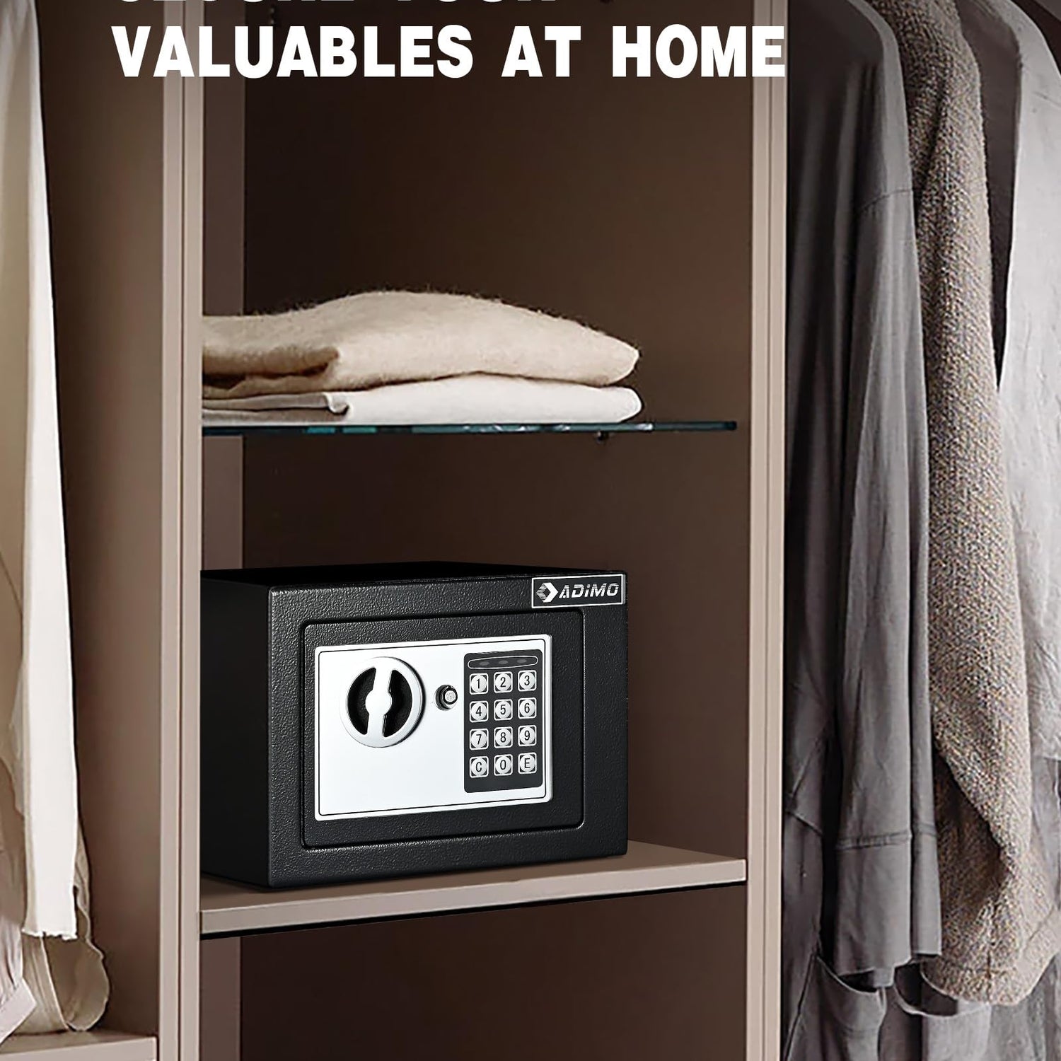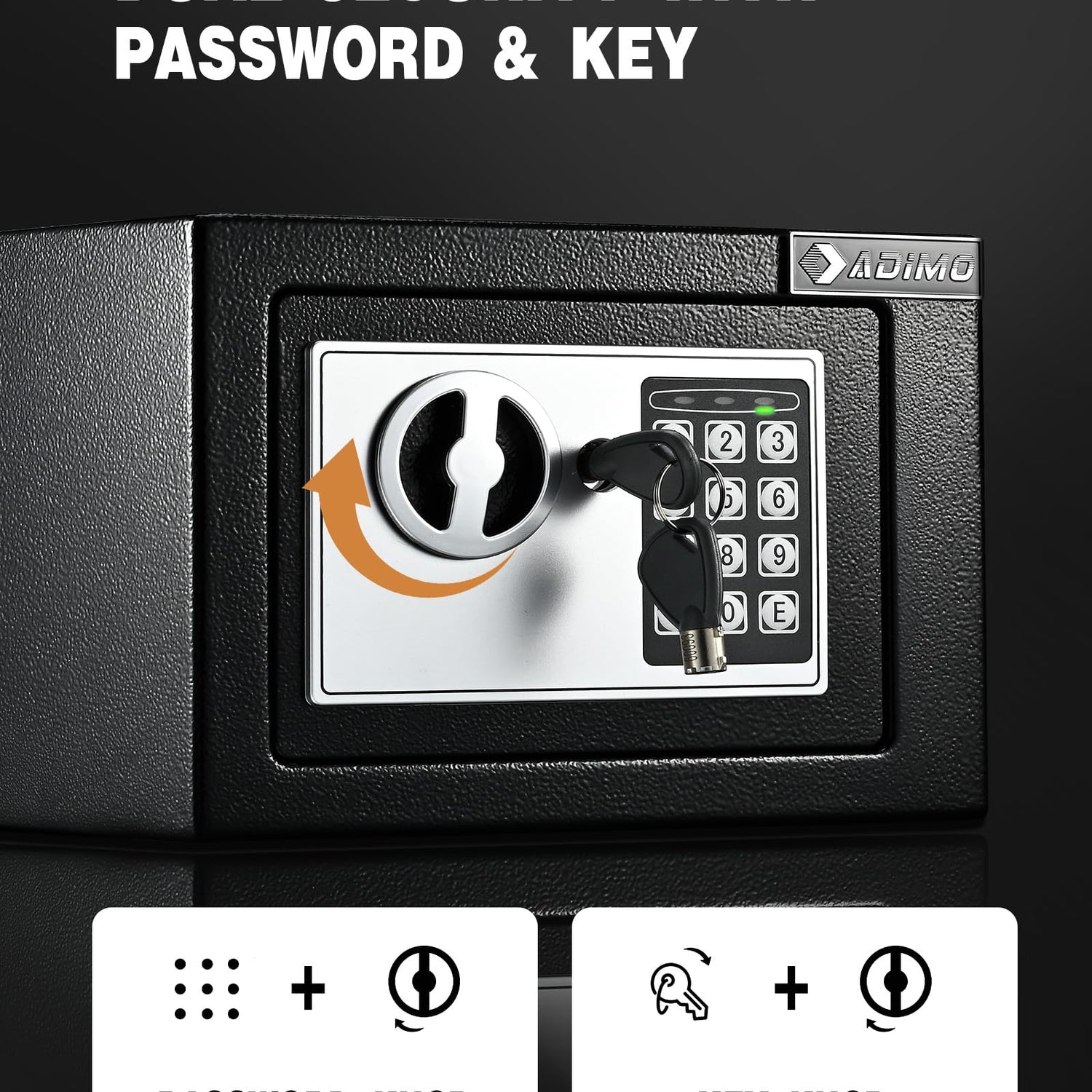 - 【Sturdy and Reliable】ADIMO small safe box is made of reinforced solid steel, and the surface has anti-corrosion and anti-wear powder coating.It ensures that your money safe is stronger and more durable. There are 3 hooks behind the home safe door, you can hang the spare keys of the house and the car (do not lock the key of the safe in the safe), jewelry, and other valuables on the hook.