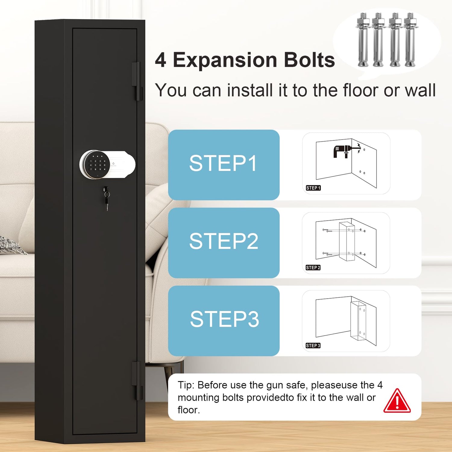 - 【Multiple Insurance】The gun cabinet uses a digital combination lock, which ensures security and allows for quick access to firearms. In addition, the gun cabinet is equipped with a spare key that can be used to open the door if you forget the password or the battery runs out. Note: The key should be stored in a safe place and should not be placed in the rifle or shotgun cabinet.