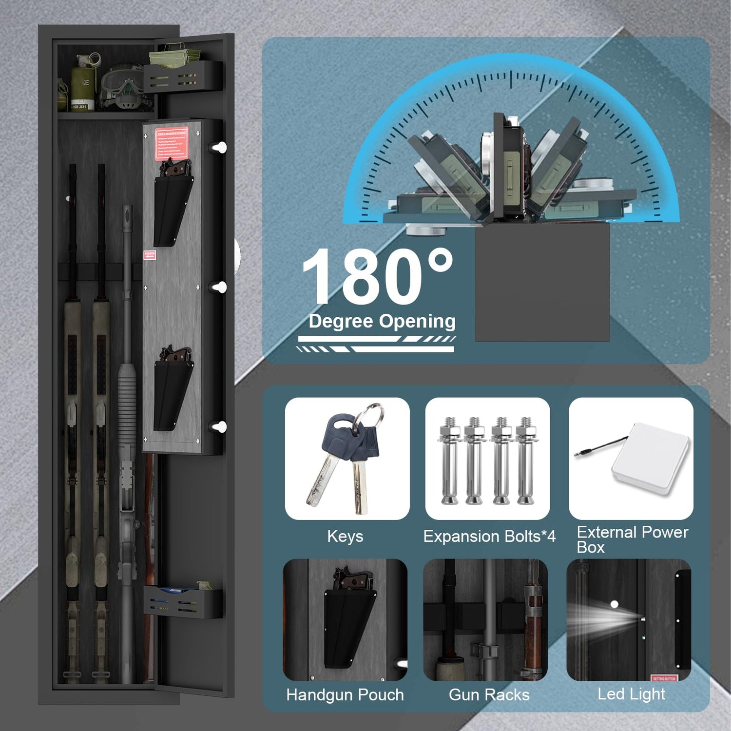 - 【Inner Safe Box & Accessories】There is a non-removable safe at the top of the rifle safe interior, which can hold some precious items. Included accessories are inner safe box key*2, gun cabinet key*2, screws*5, emergency battery box*1, manual*1.