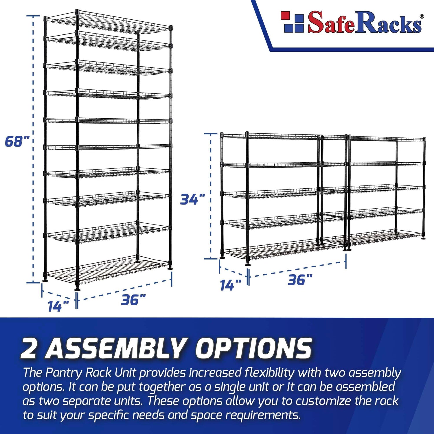 - CUSTOMIZABLE STORAGE: Organize your kitchen, pantry, or garage with the SafeRacks adjustable wire shelving unit with 10 shelves. It's 14D x 36W x 68H size, elegant black finish, and heavy-duty steel construction make it perfect durable storage option for food cans, jars, and utensils.