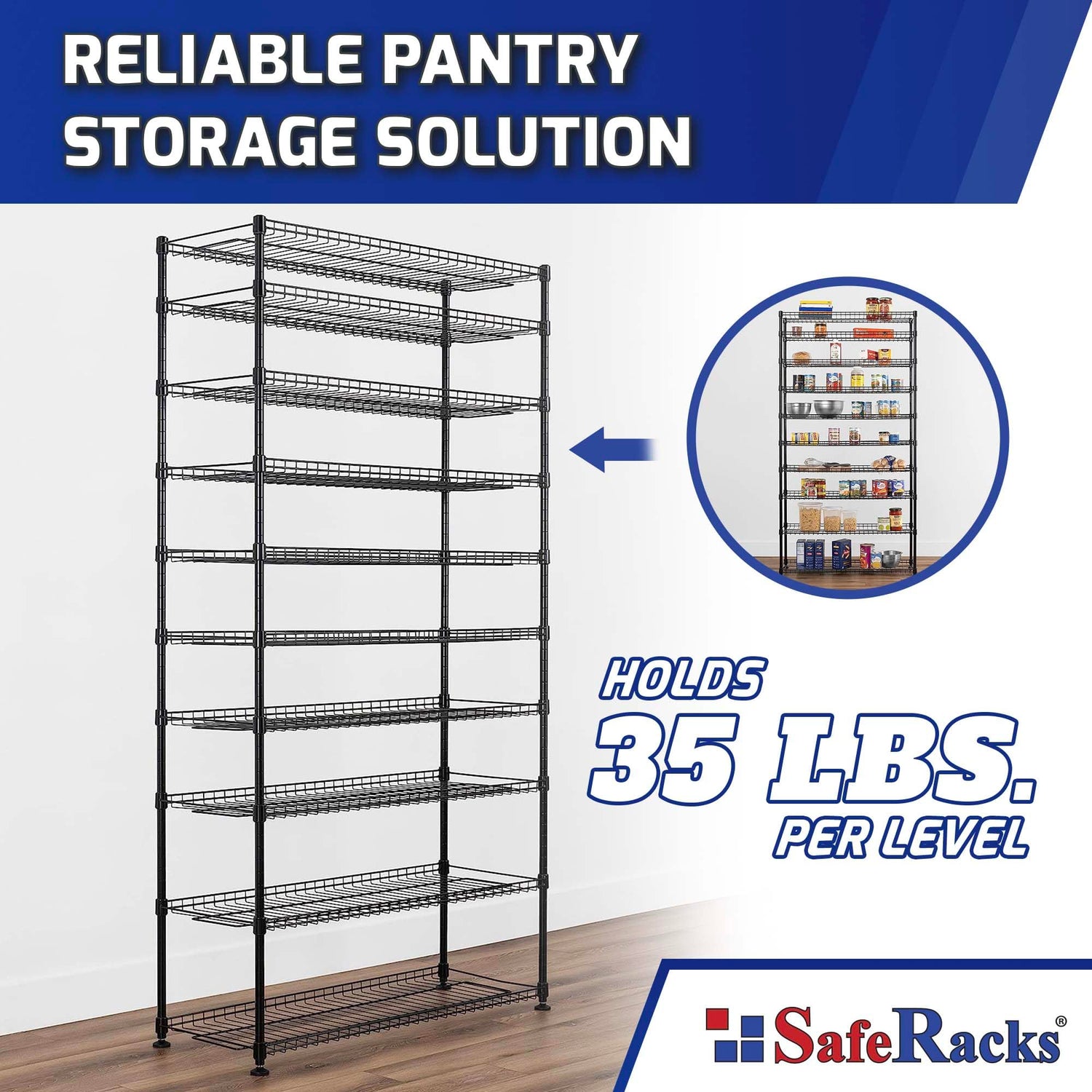 Details: Maximize your kitchen and pantry storage with the versatile SafeRacks Pantry Rack. Designed to accommodate food cans, jars, and kitchen utensils, this storage shelf is a game-changer. Crafted from heavy-duty steel, it boasts 10 adjustable wire shelves that provide ample space for all your household essentials. Whether you have a compact kitchen or a spacious pantry, this stackable kitchen rack offers flexible storage options. You can assemble it as one unit or divide it into two units to suit your space and organizational needs while its matte black finish adds a touch of sophistication to your kitchen decor. Rest assured that this pantry rack is not only stylish, but built to withstand heavy loads over a long period of time. Created with durability in mind, we designed this the shelf to safely store your items in a stylish and convenient way. Say goodbye to cluttered countertops and embrace the convenience of an organized and efficient kitchen with the SafeRacks Pantry Rack.