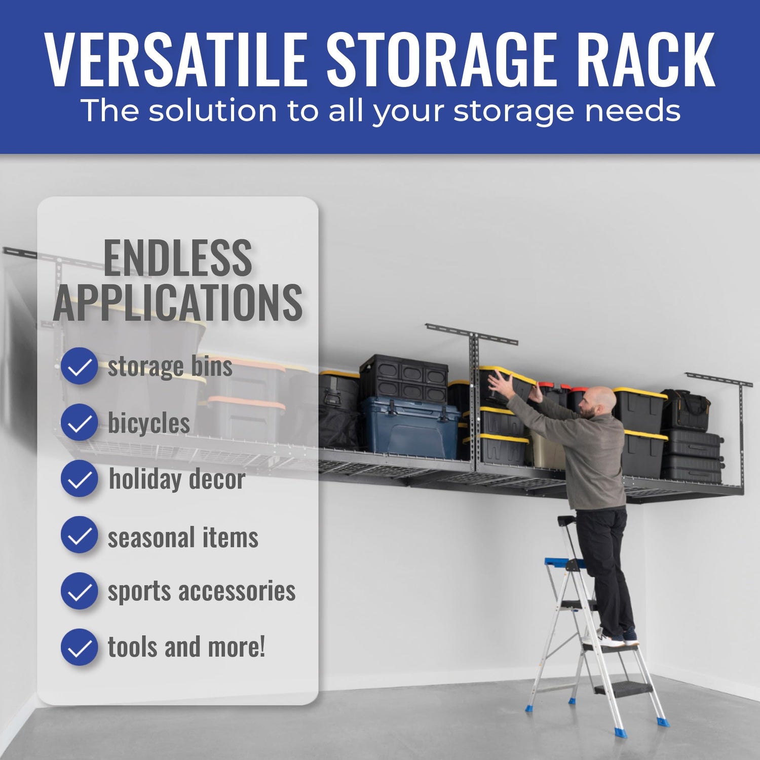 - INDUSTRIAL STORAGE RACK: Our industrial rack is a great fit for virtually any garage. It features a full 600 pound weight capacity and adjustable height ranging from 18 to 33 inches from the ceiling. Store storage bins with ease with our hanging storage rack.