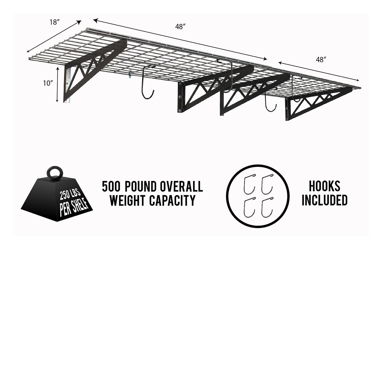 COMPONENTS: Wire decking is made from Heavy-Duty 5 Gauge Steel wire and used with Heavy-Duty 12 gauge wall brackets. Each wire deck measures 18”x48” giving you a total of 18”x96” of shelving. Also included are 4 deck hooks used to hang bikes, bags, chairs, snowboards, etc.