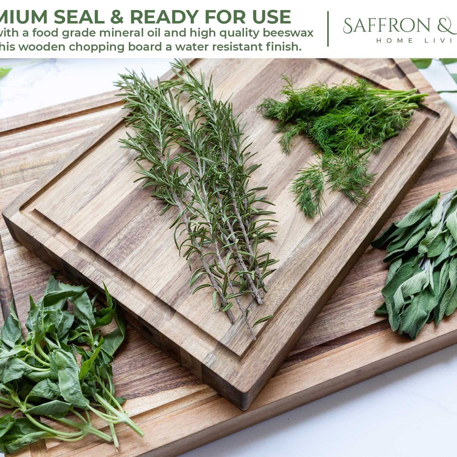 - Each wood board is pre-seasoned with a premium seal and ready to use as soon as it arrives. Saffron & Sage wood cutting boards are sealed with a special blend of food grade mineral oil and high quality beeswax to give this wooden chopping board a water resistant finish