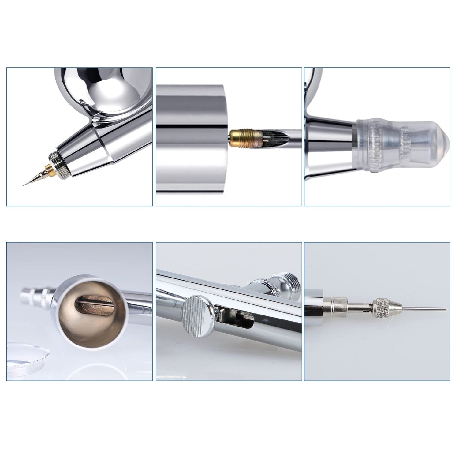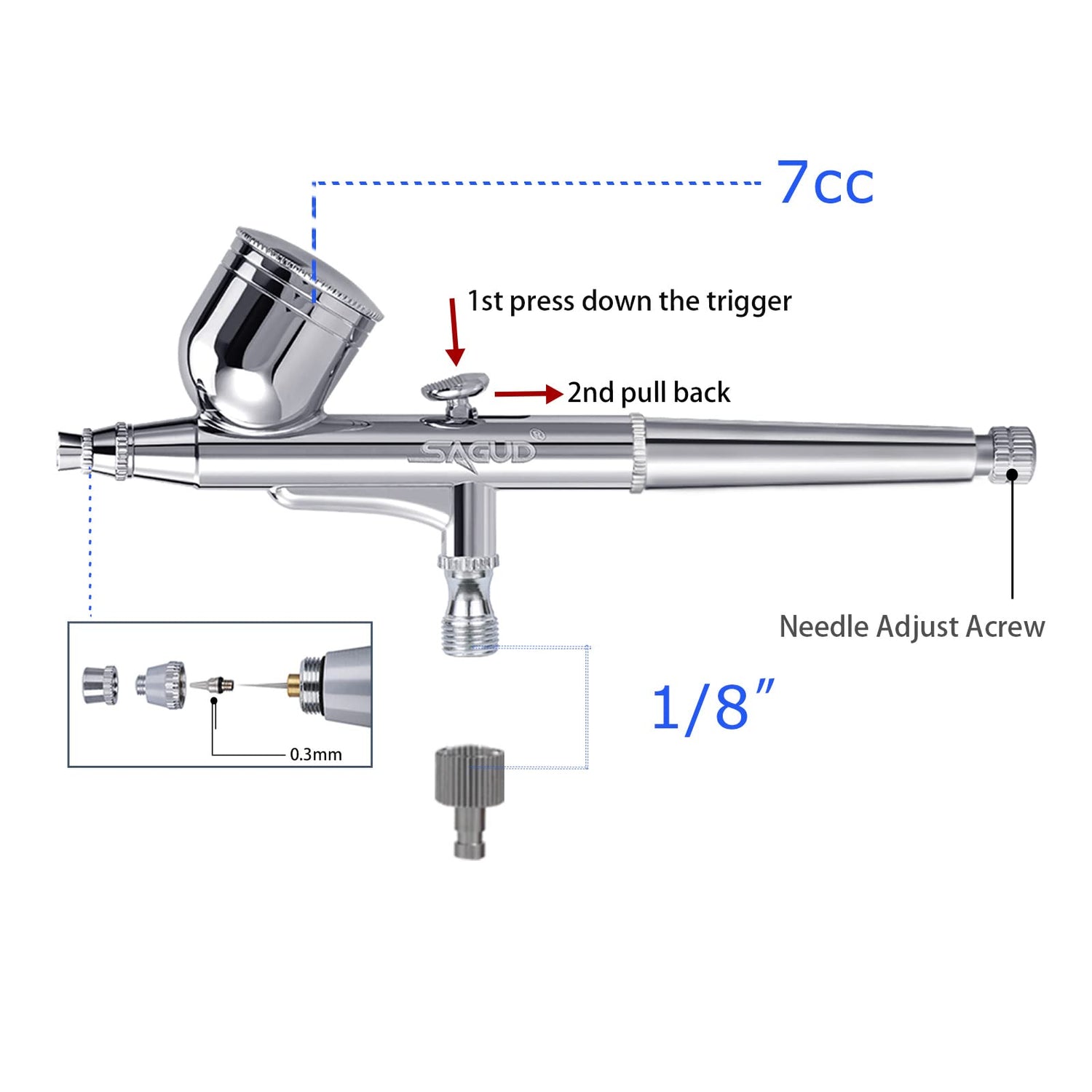 - AIRBRUSH KITS: Air brush kit is 0.3mm airbrush set with 0.3mm nozzle & needle. The cup capacity is 1/3 oz. SAGUD airbrushes are all with quick release disconnect coupler fitting and a kit of airbrushing O-Ring.