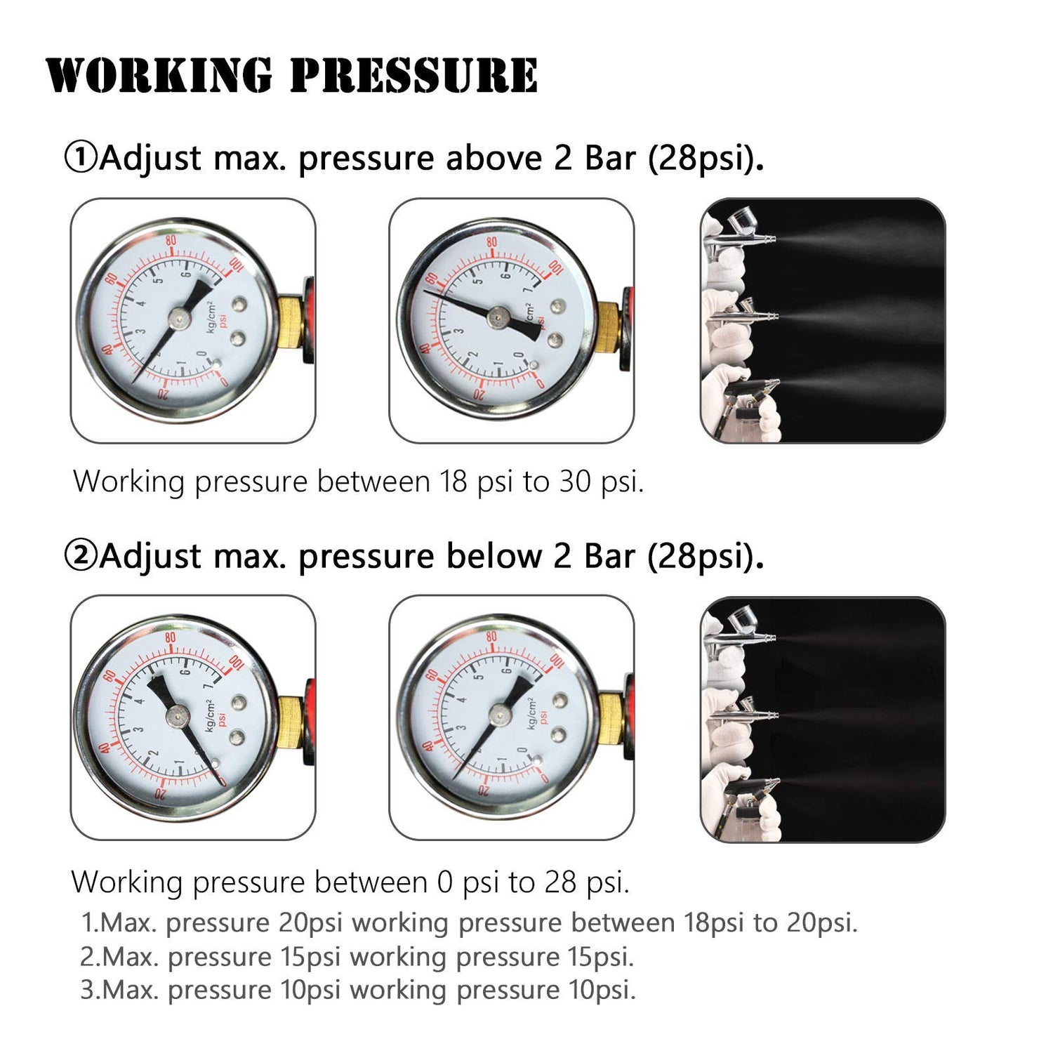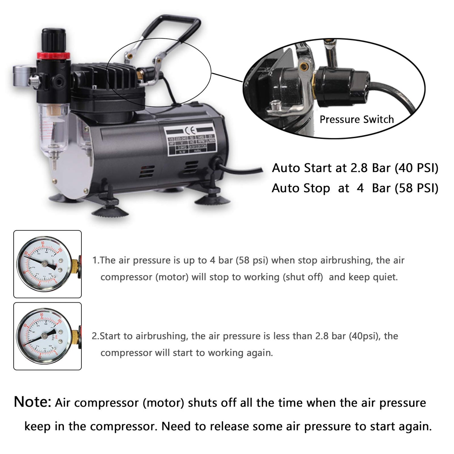 - 1 / 5 HP AIRBRUSH COMPRESSOR: Mini oil-free air compressor is portable, lightweight, lower noise, lower temperature with maximum air pressure of 58 psi. Auto stop at 58 psi, Auto start at 40 psi. The working pressure is between 18 psi to 30 psi. Suit for 0.2 mm – 1.0 mm airbrush guns.