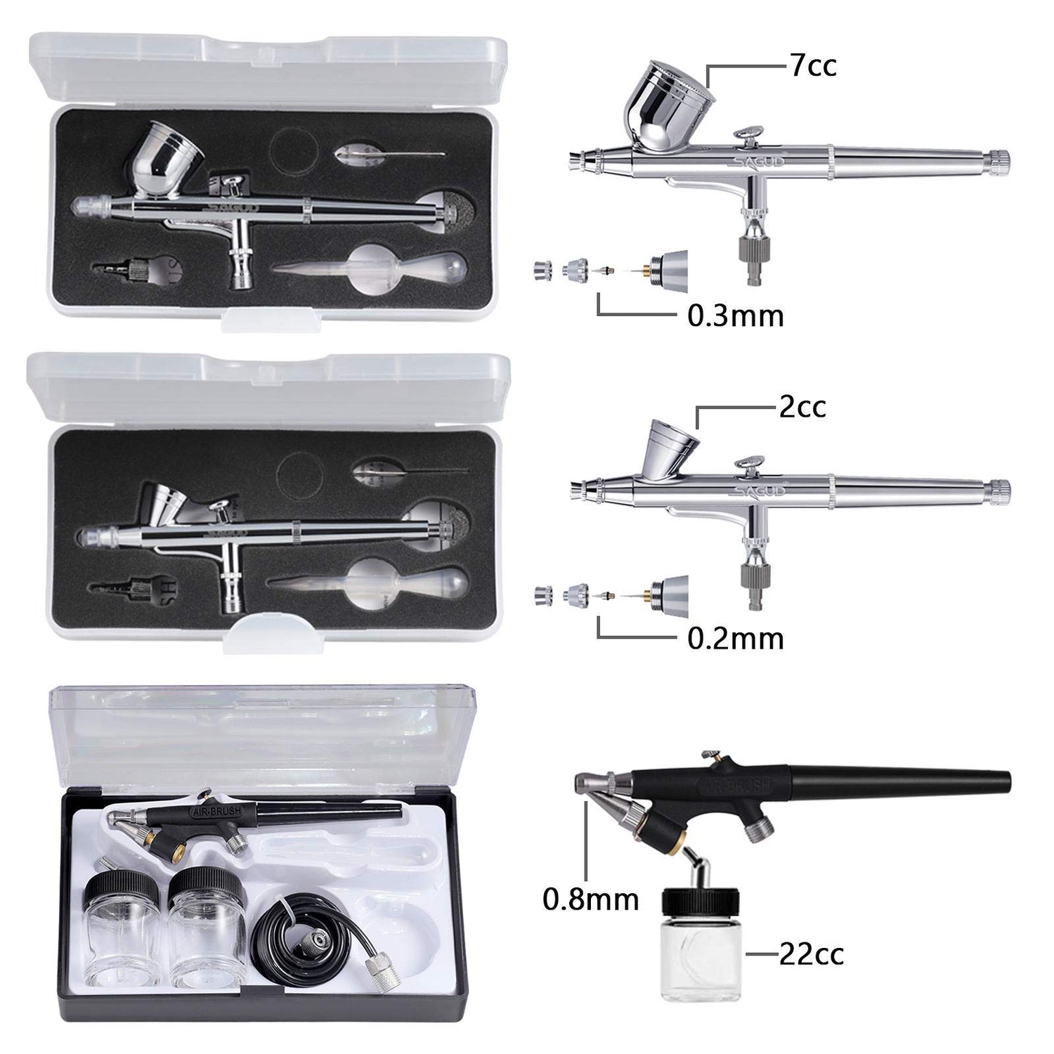 - 3 SAGUD AIRBRUSHES: SD 130 is dual – action 0.3mm with a 1 / 3 oz. gravity feed fluid cup, SD 135 is double action 0.2mm with a 1 / 16 oz. gravity feed fluid cup, SD 138 is single – action 0.8mm with 3 / 4 oz. siphon bottles. Used for hobbies, auto graphics, nail art, crafts, temporary tattoos, cake decorating and more.