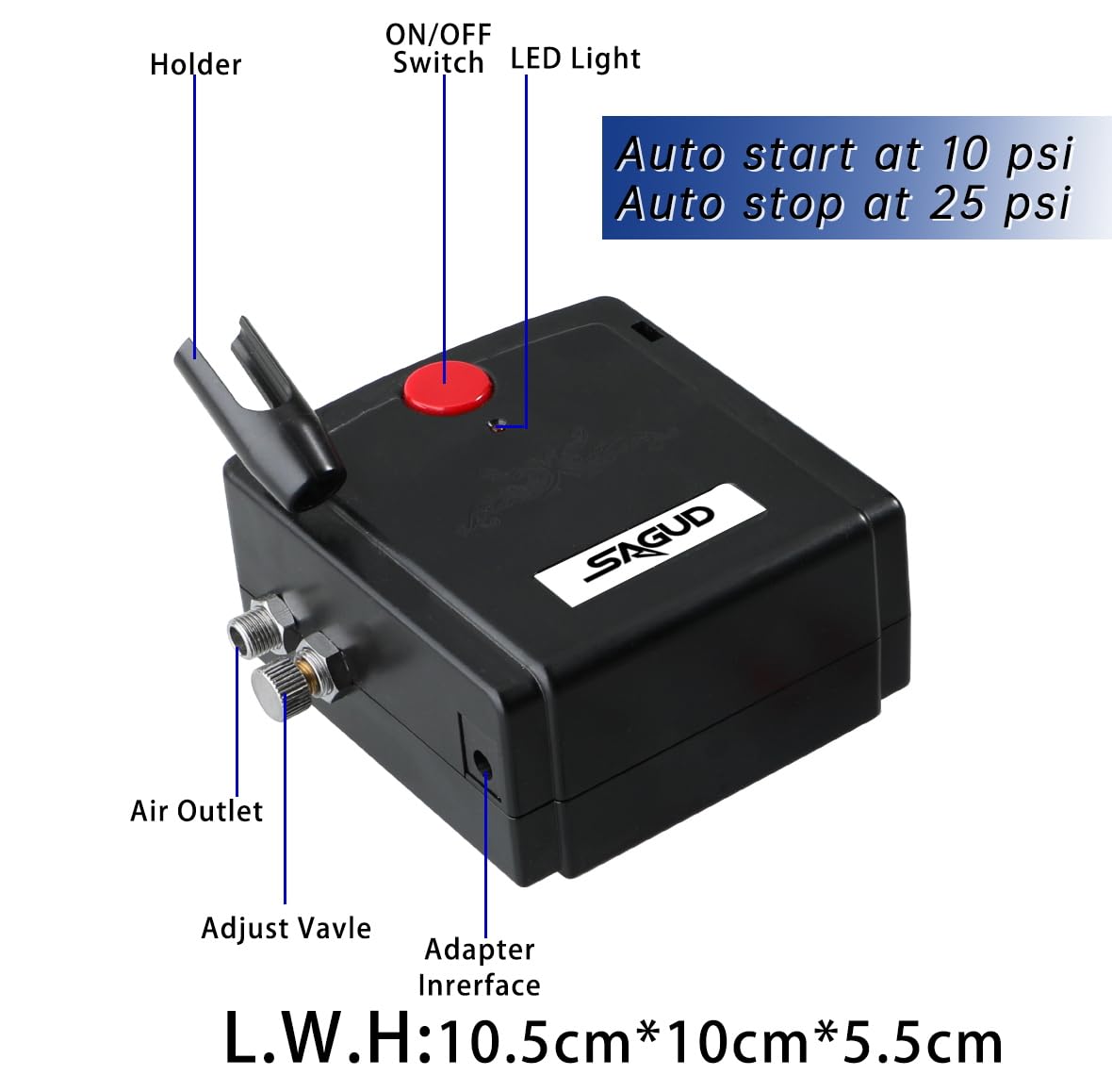 - SAGUD Mini air compressor Model AC - 100 is black color, portable, lightweight and small size with a maximum air pressure of 25 psi. The air compressor can be stop when not in use. Automatic on / off function is auto start at 10 psi and auto stop at 25 psi. Include an Airbrush Holder. If the airbrush can not spray out, you have to thin the paint a lot, like the consistency of milk. Even your "Ready to Airbrush" paint like model also need to thinned.
