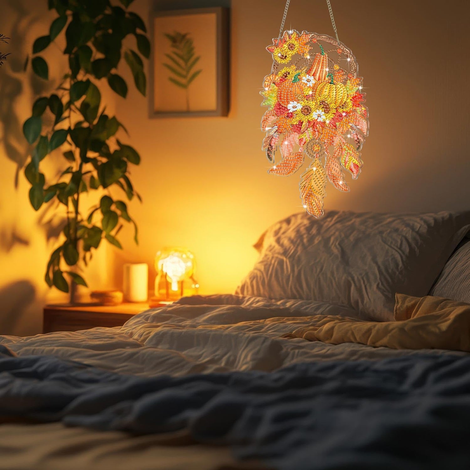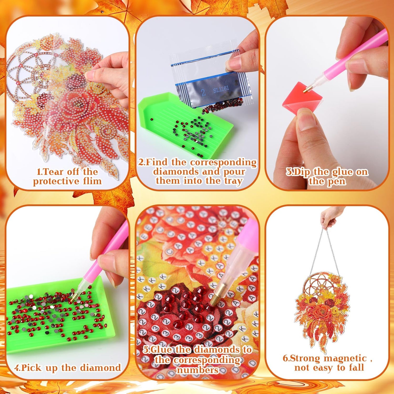 - Diamond Painting Kits Include: you will get two fall themed diamond art suncatcher with different patterns; The package contains: DIY drawing board, chain, tool pen, drill disc, drill mud and special-shaped diamonds, providing everything you need to complete the art