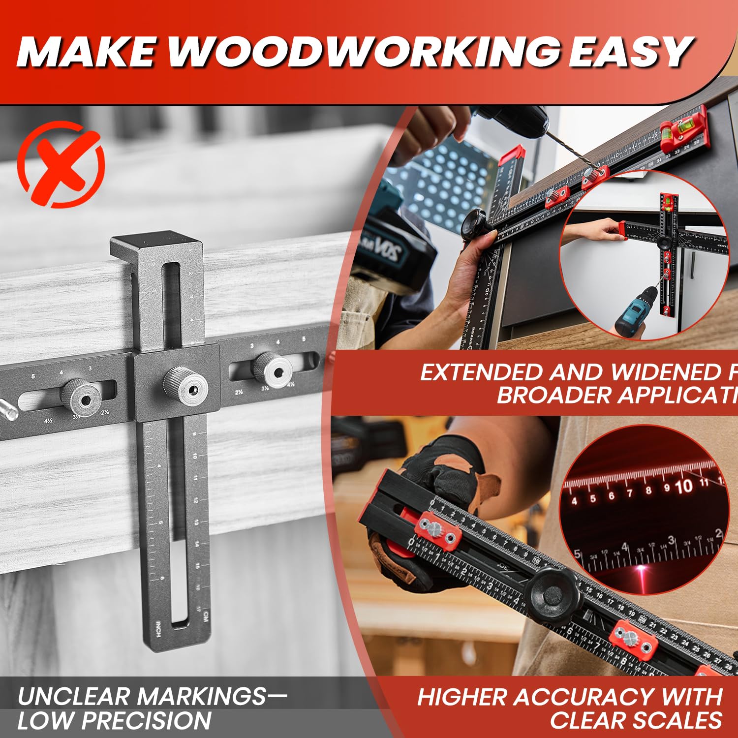 Saker 4-in-1 Drilling Positioning Ruler, Adjustable 13.78in Multifunctional T Square Ruler, Cabinet Hardware Jig, Marking Gauge Tools for Woodworking, Cabinet Drawer Door Hole Drilling Template