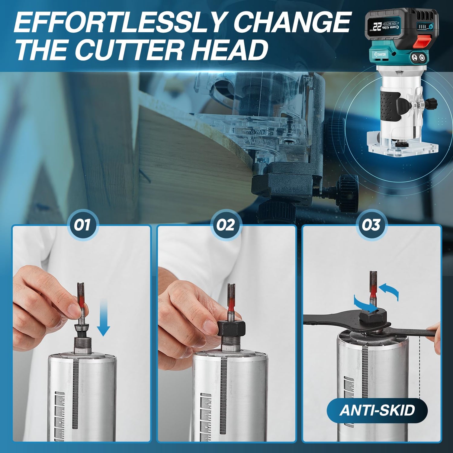 - 【User-Friendly Features 】Saker compact router tool cordless features a non-slip handle for easy operation, allowing for effortless cutting head changes and includes a safety lock switch to ensure safe handling during use.