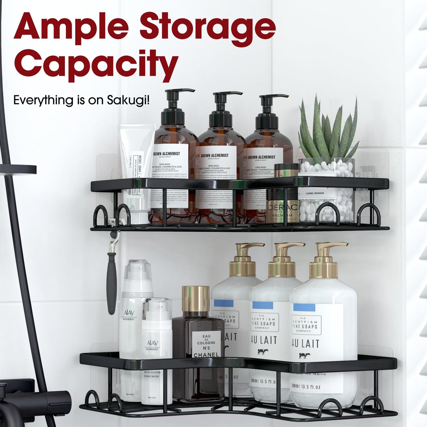 Sakugi Corner Shower Caddy - 2 Pack, Adhesive Shower Organizers, Rustproof Stainless Steel Shower Shelves with 8 Hooks, No Drilling Bathroom Organizers and Storage Racks, Space-Saving, Black,Medium